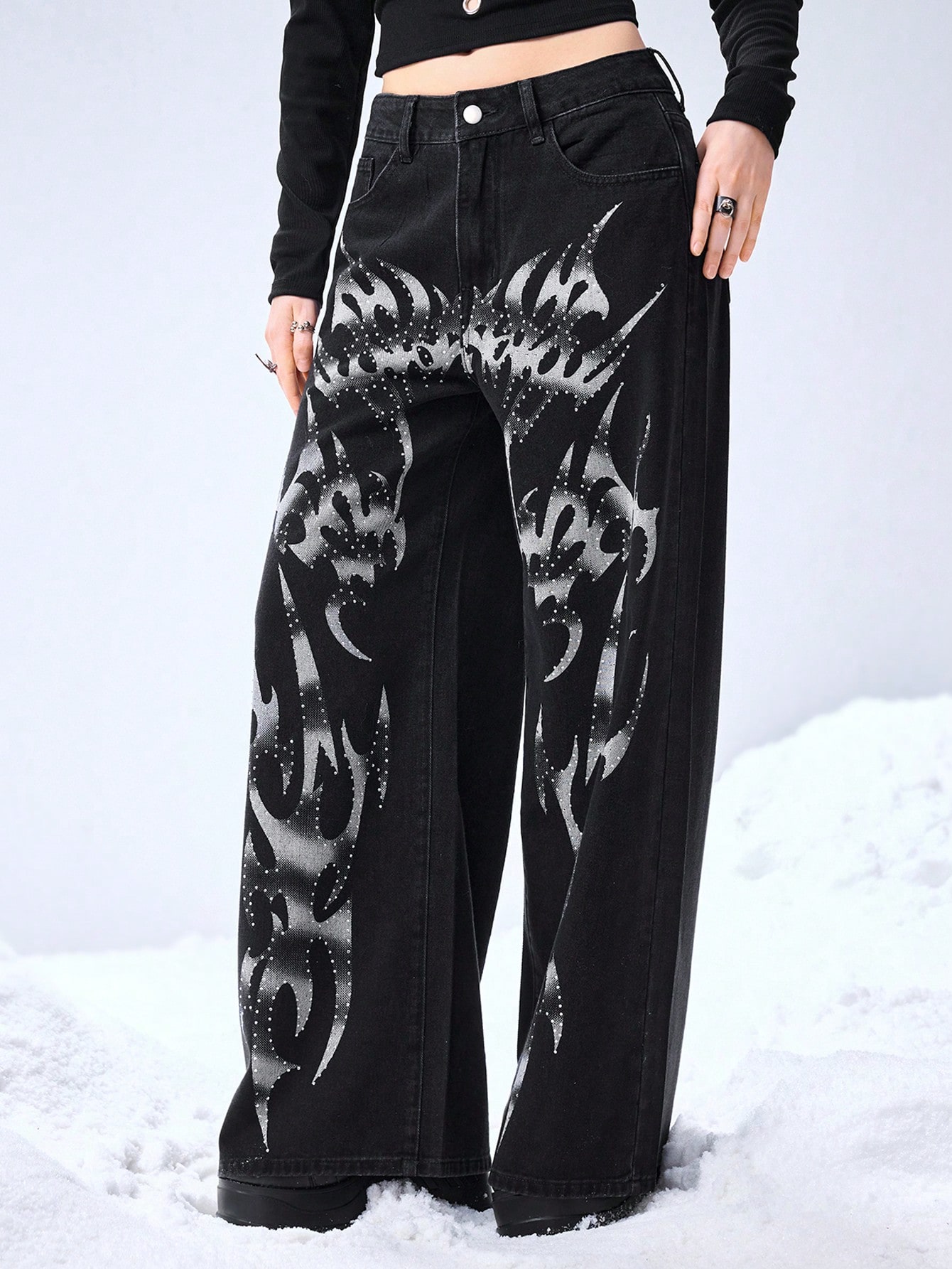 Grunge Punk Y2K Streetwear Chic Rhinestone Embellished Irregular Pattern Loose Fit Wide Leg Jeans For Women