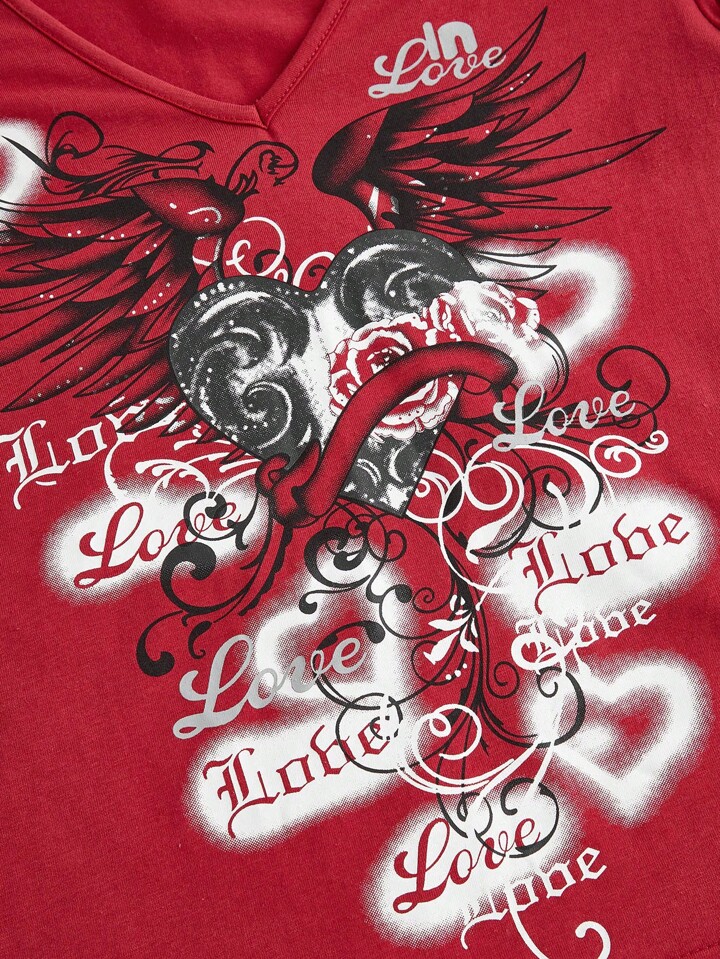 Grunge Punk Y2K Style Heart Print V-Neck Long Sleeve Casual T-Shirt For Women
