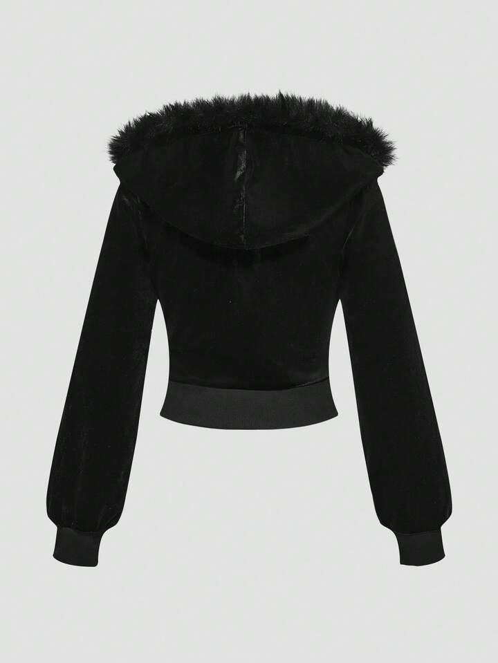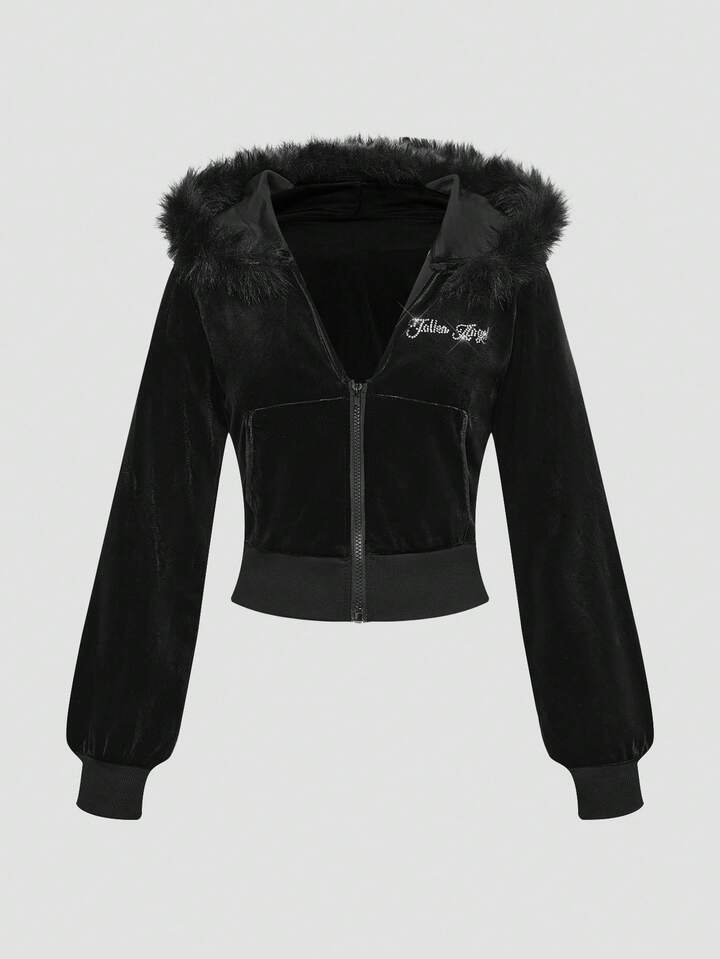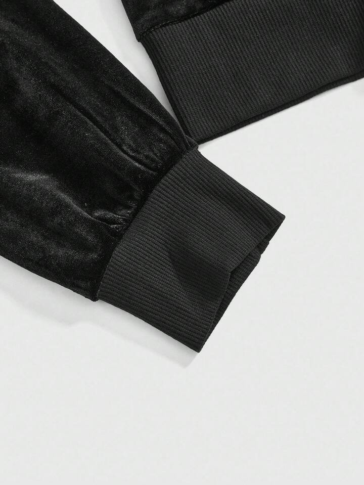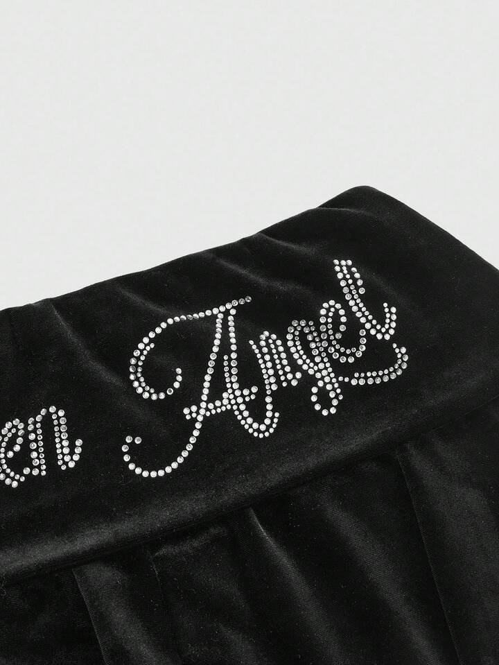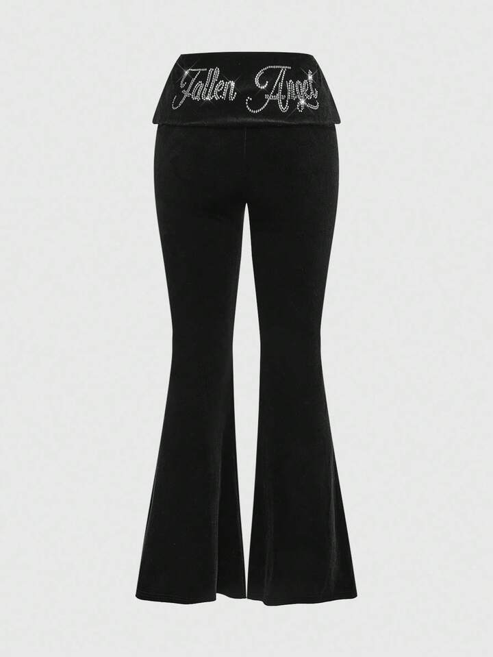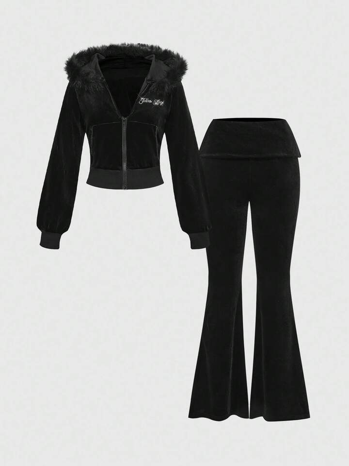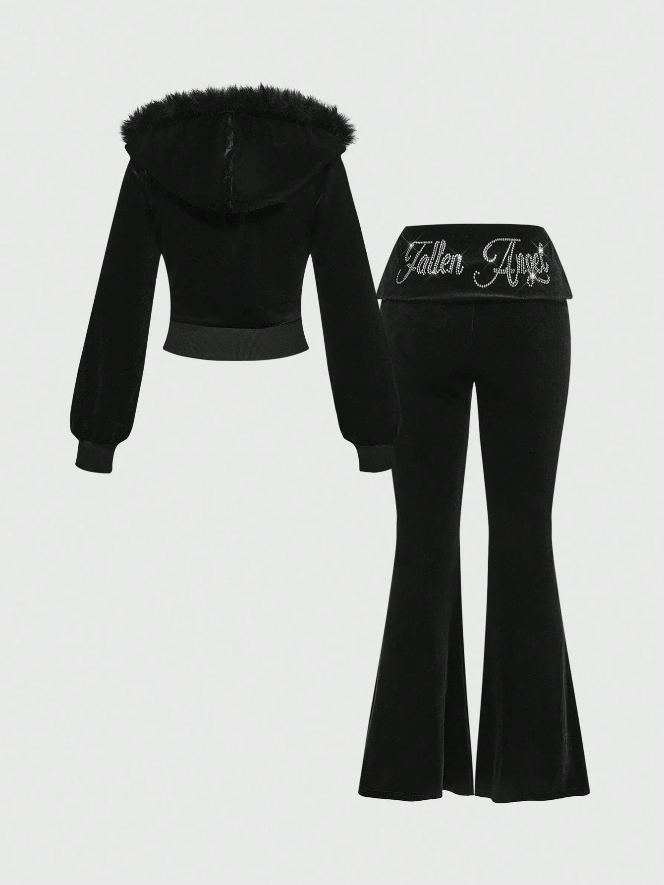 Grunge Punk Y2K Velvet Rhinestone Graphic Cropped Hoodie & Low-Rise Flare Pant2 Piecesce Set For Women