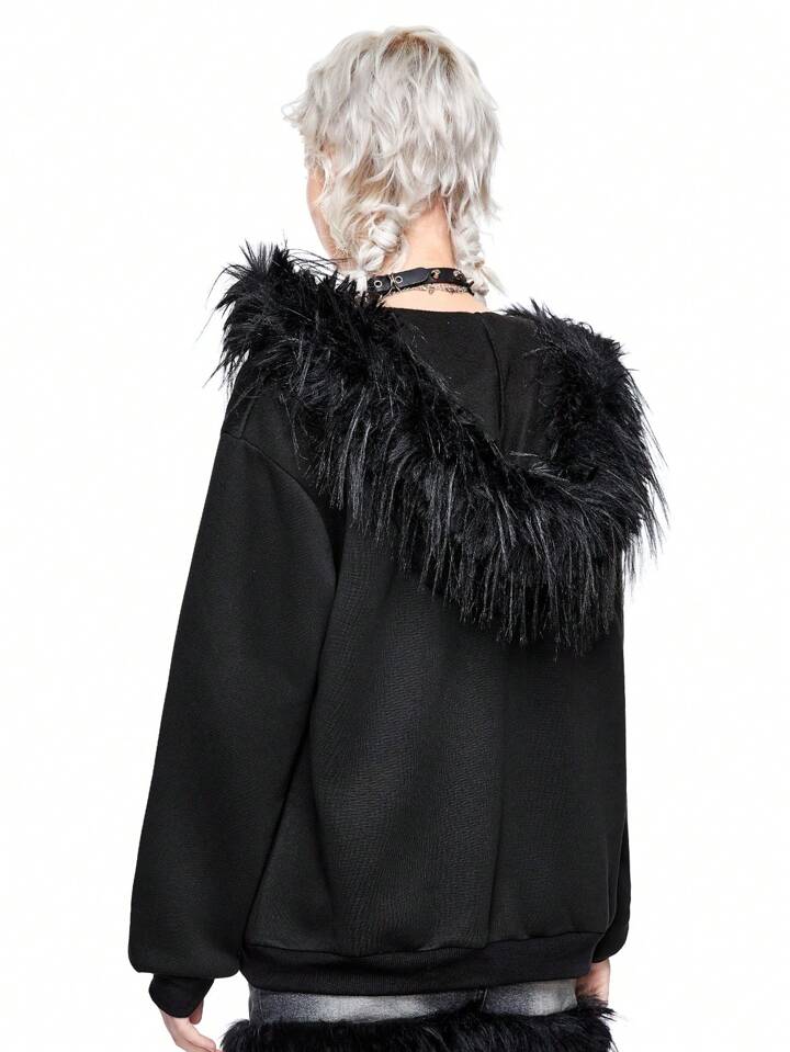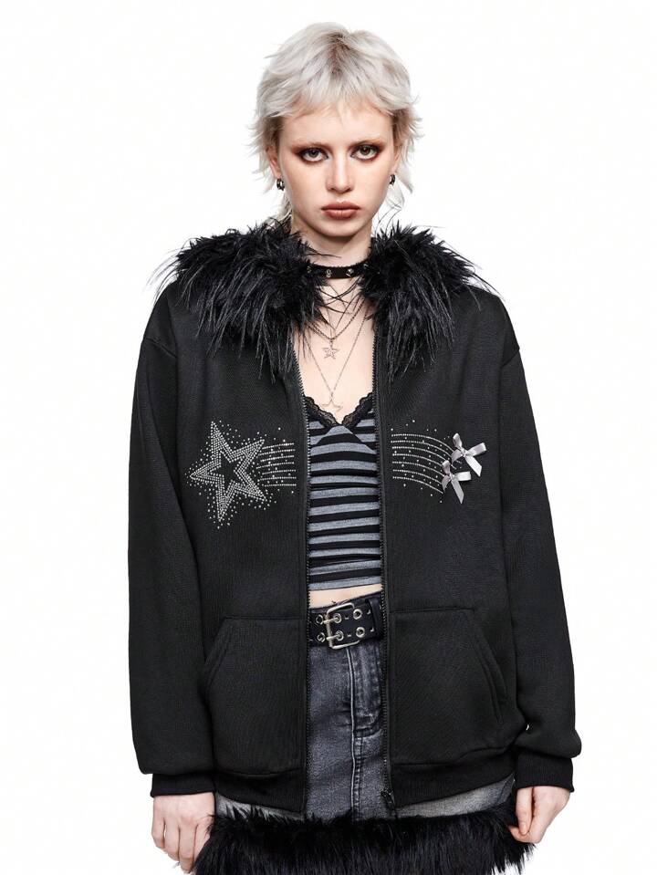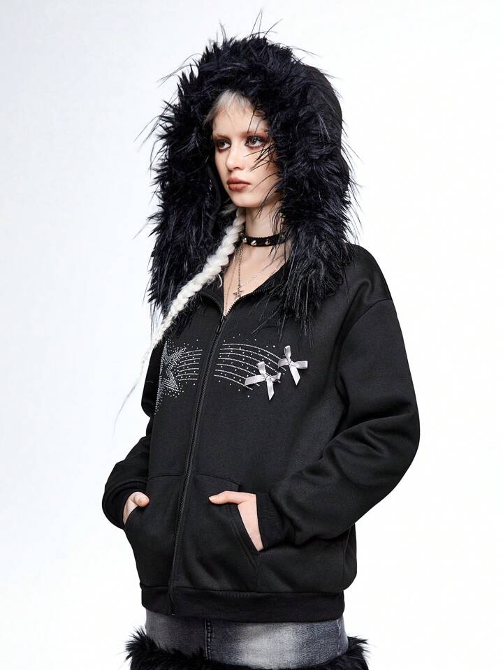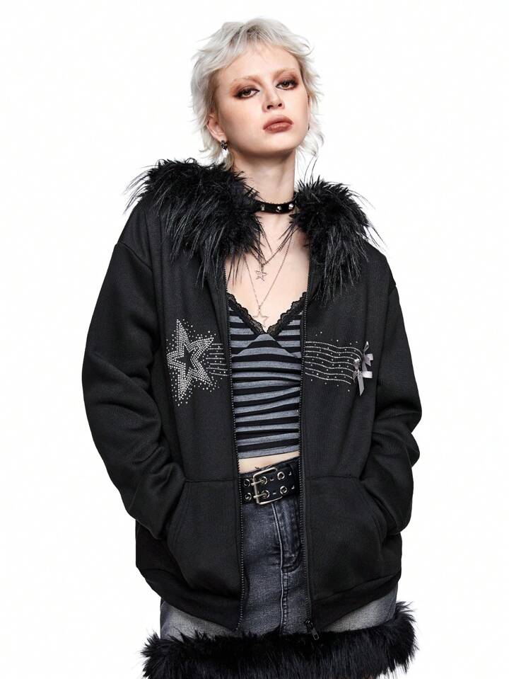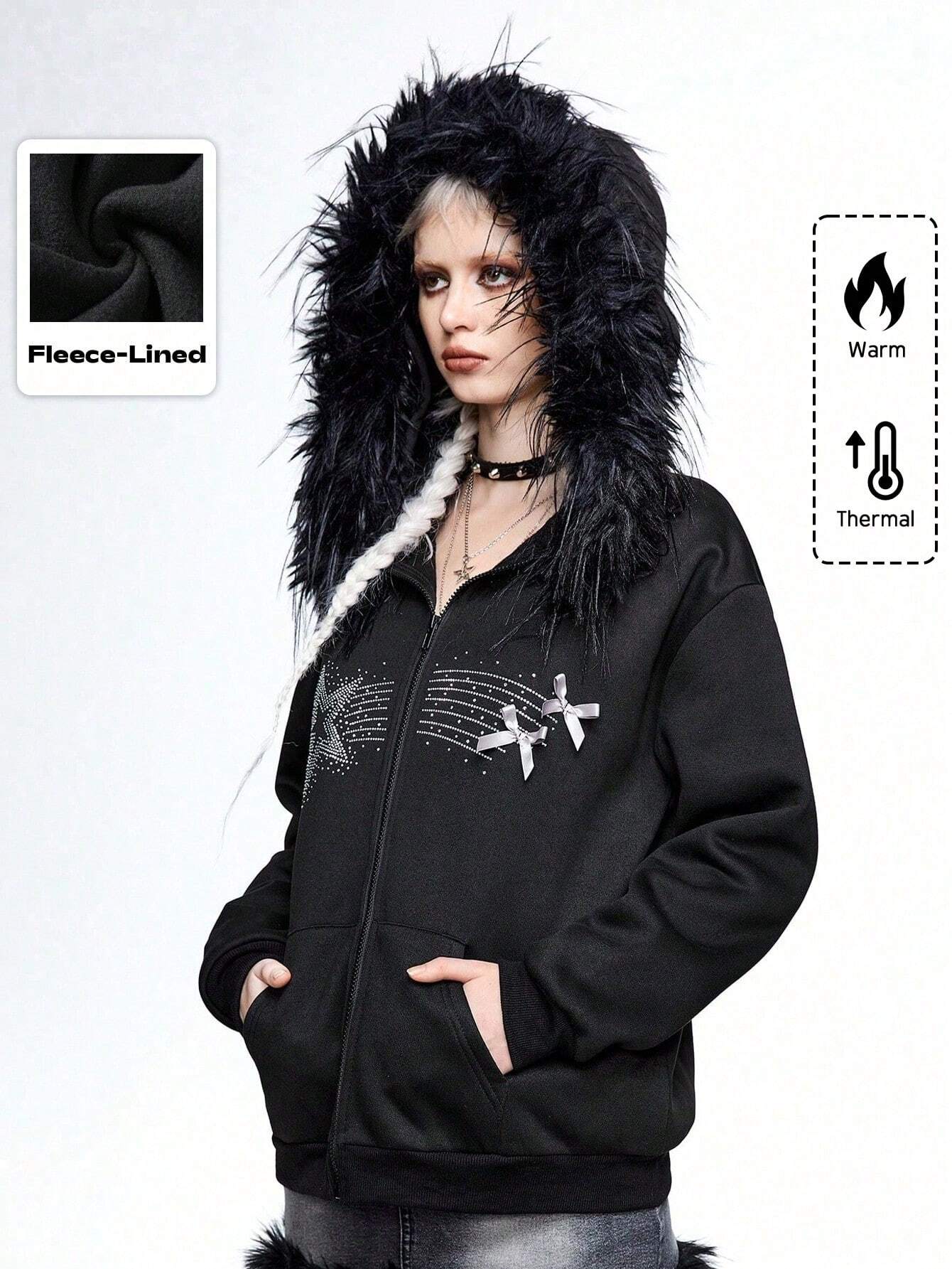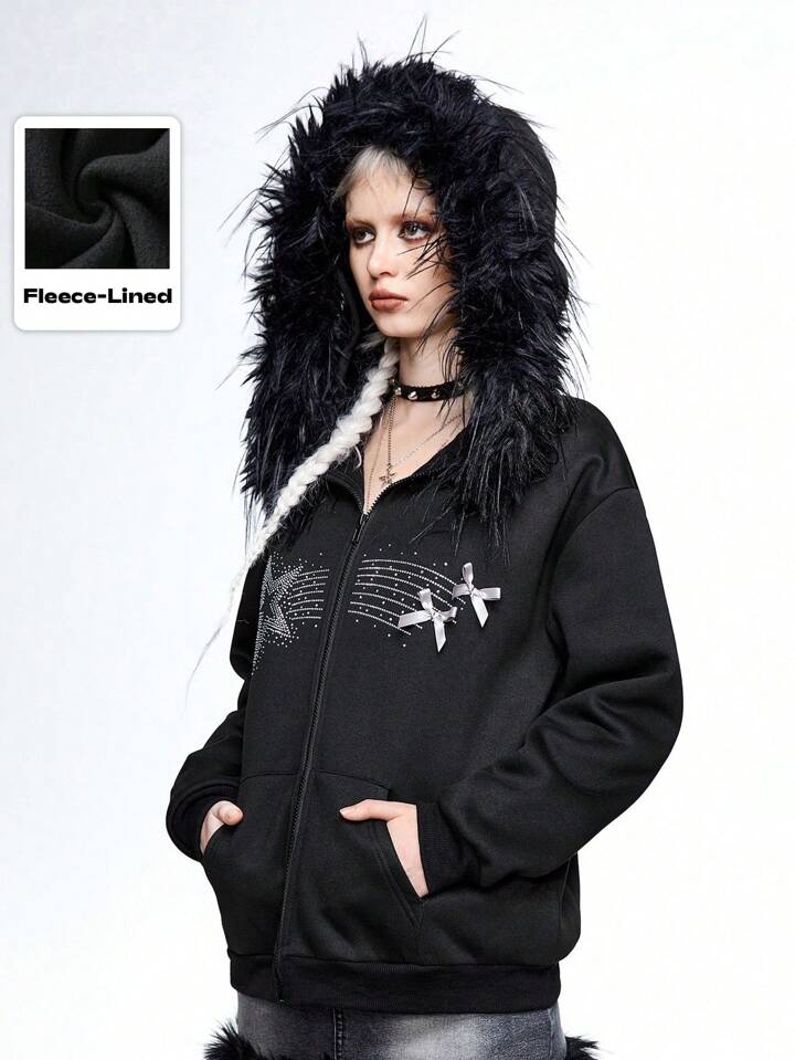 Grunge Punk Y2K Vintage Sexy Star Rhinestone Bow Oversized Hooded Fleece Sweatshirt For Women