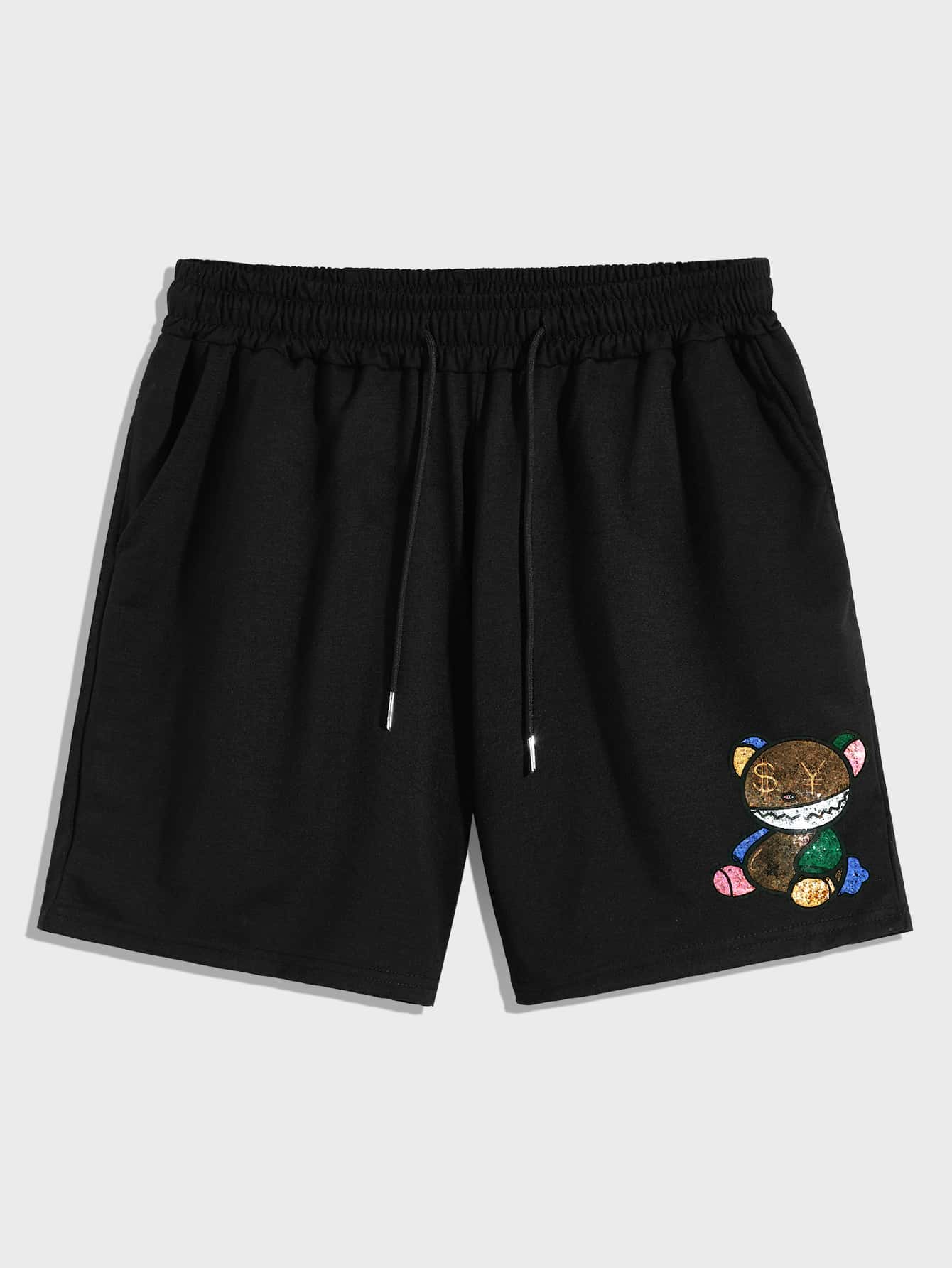 Guys Cartoon Bear Embroidery Drawstring Shorts