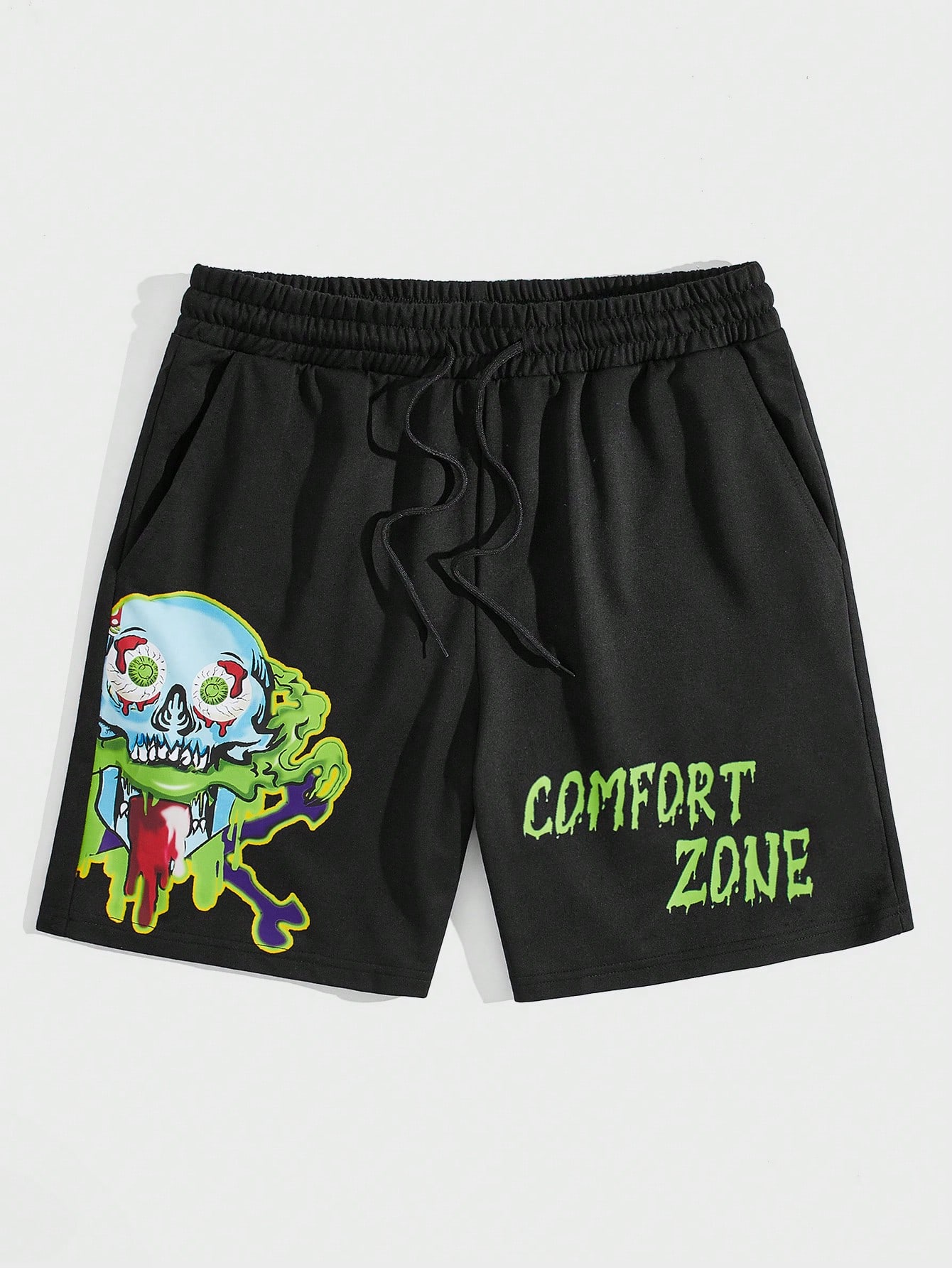 Guys Cartoon & Slogan Graphic Drawstring Waist Shorts