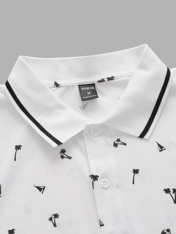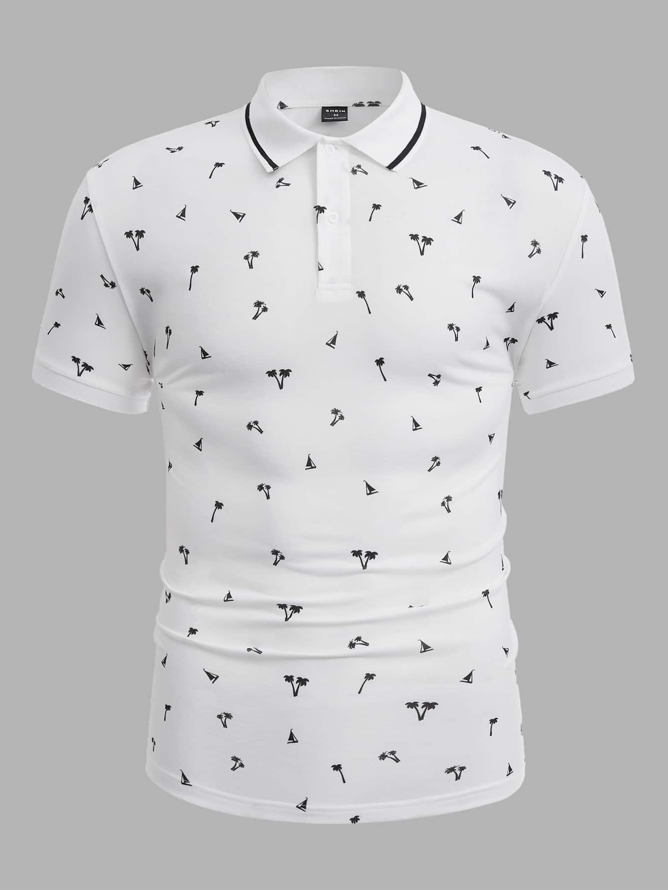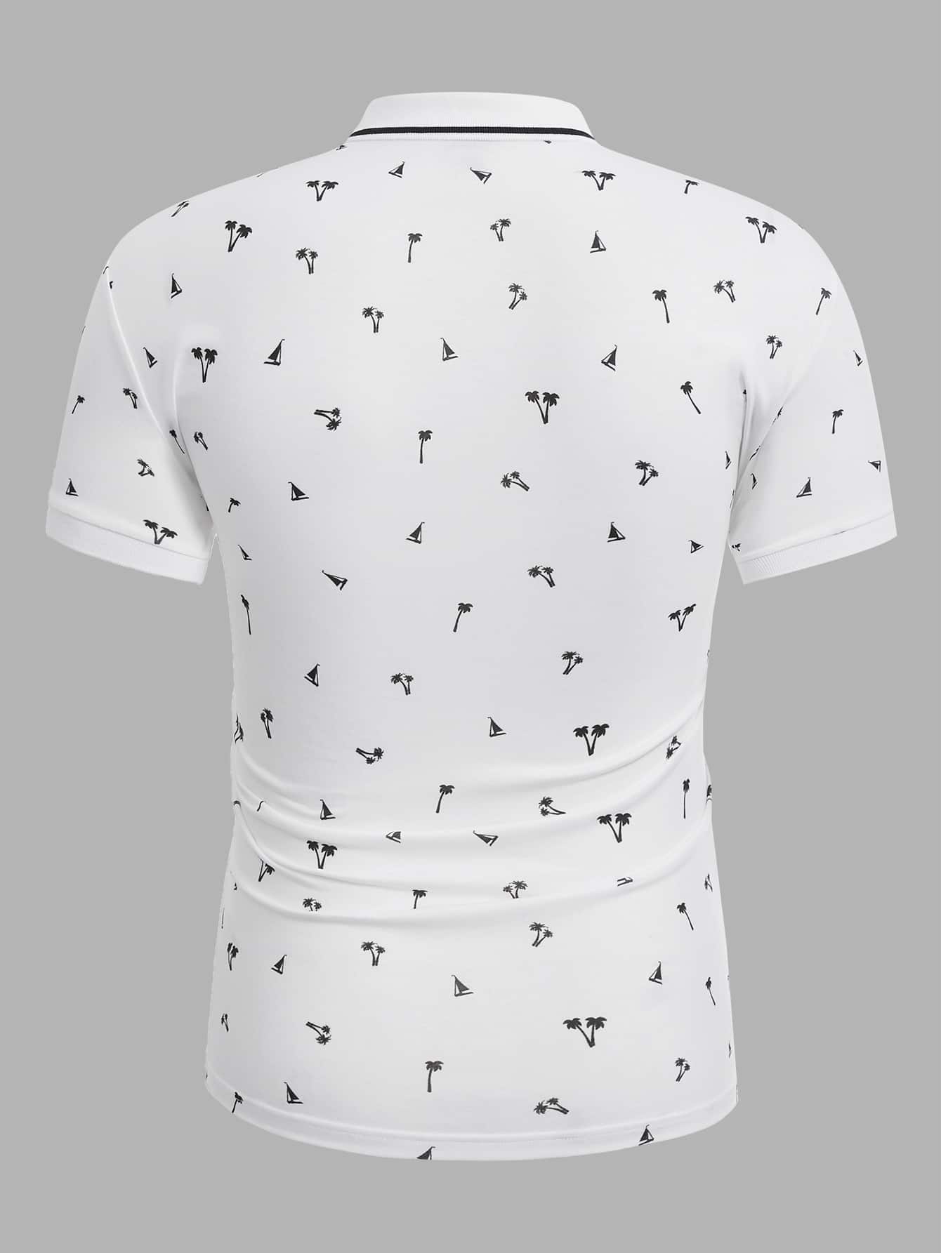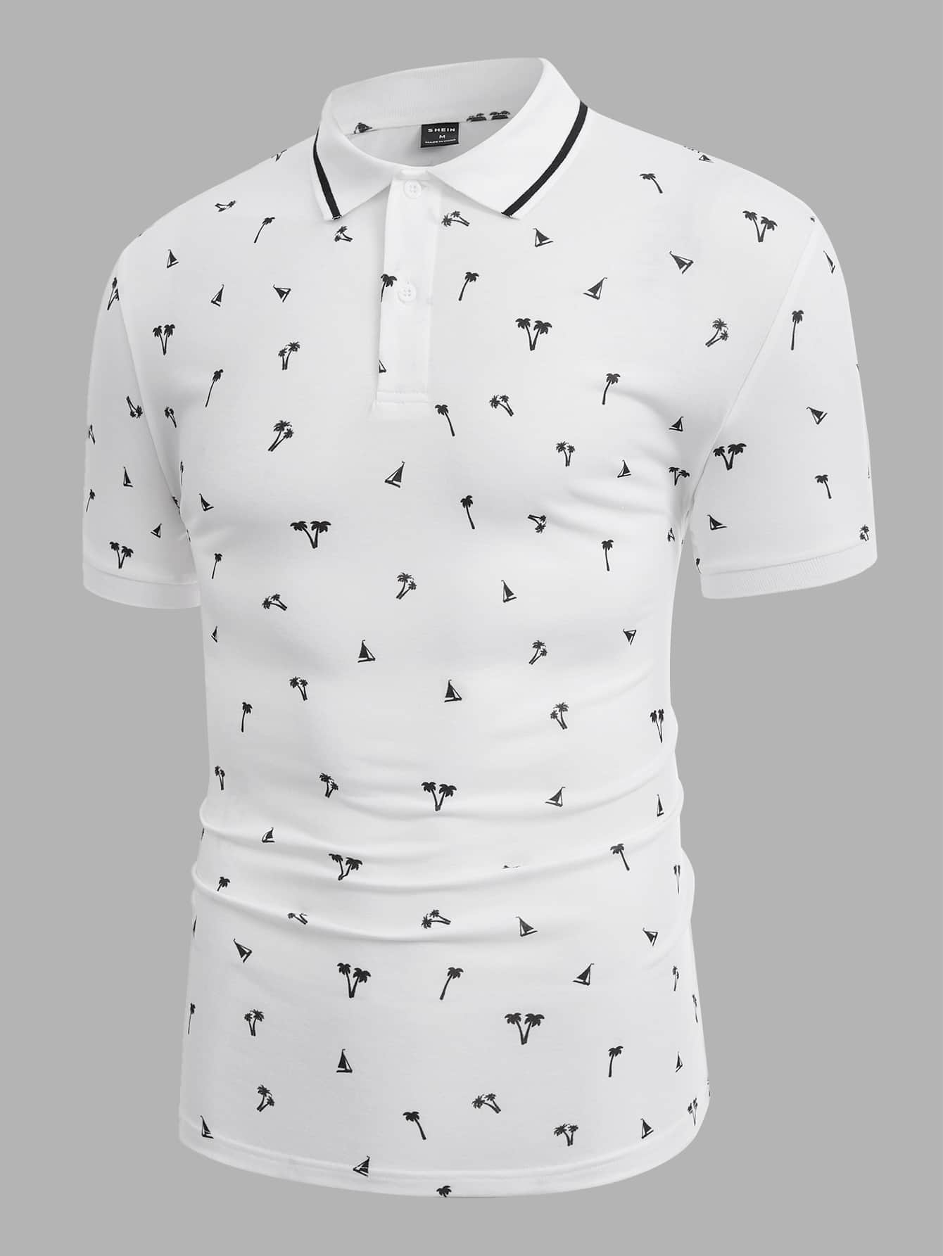 Guys Coconut Tree & Sailing Boat Print Striped Trim Polo Shirt