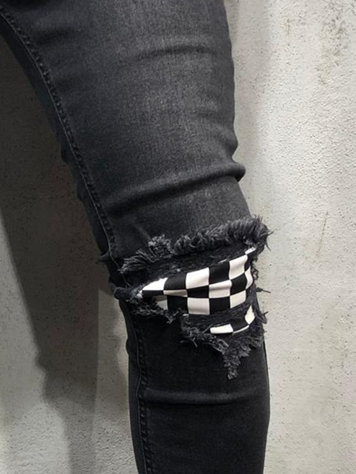 Guys Contrast Checkered Ripped Skinny Jeans