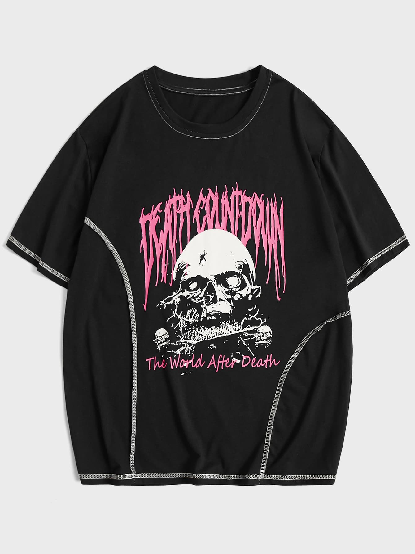 Guys Cotton Letter & Skull Print Top-stitching Tee