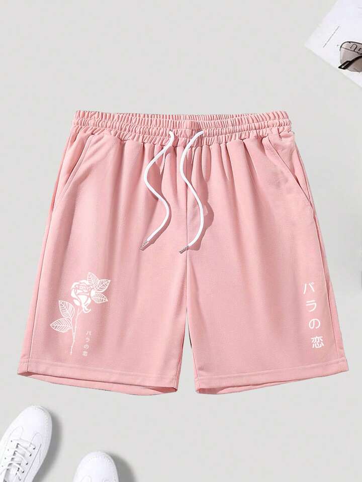 Guys Floral & Japanese Letter Graphic Drawstring Waist Shorts