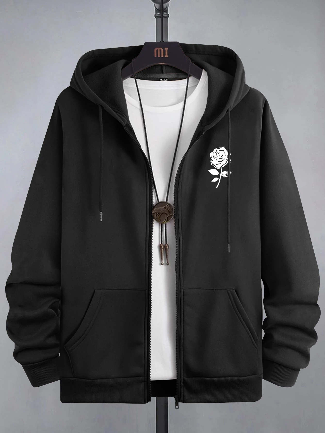 Guys Floral Print Zip Up Thermal Lined Drawstring Hoodie Without Tee