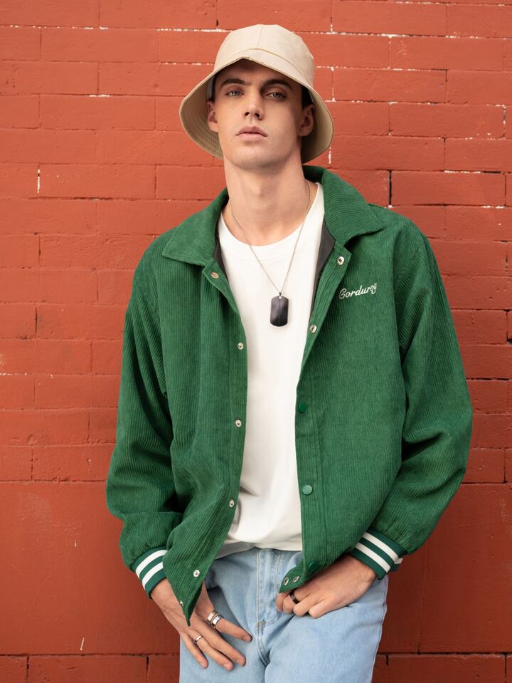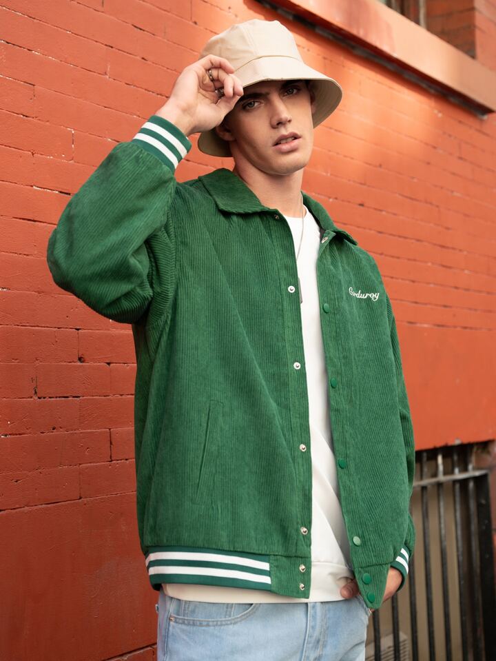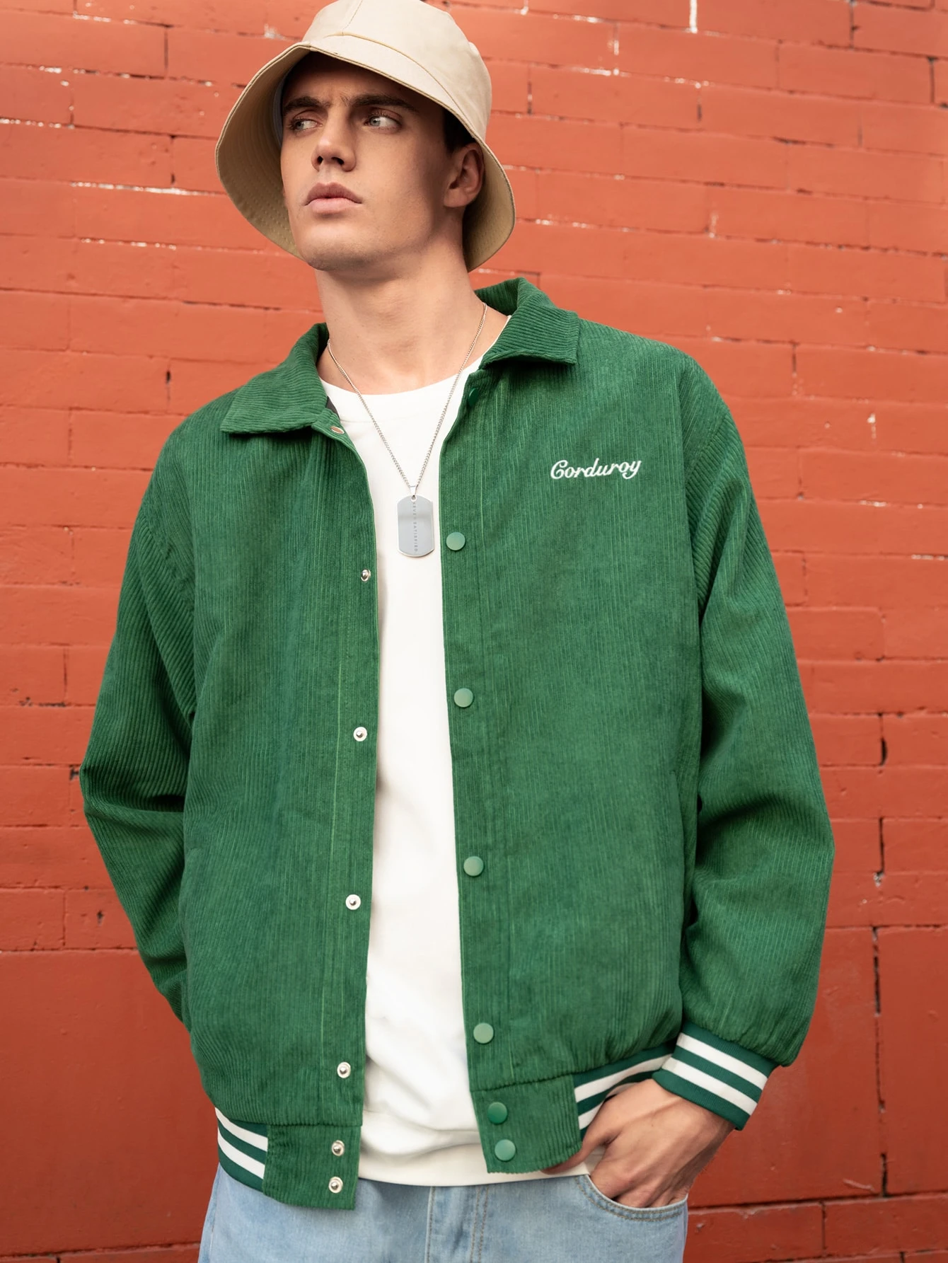 Guys Letter Embroidery Striped Trim Corduroy Jacket