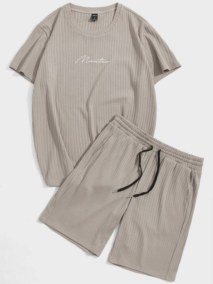 Guys Letter Embroidery Tee & Drawstring Waist Track Shorts Set