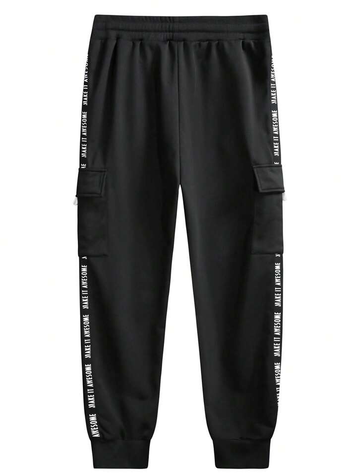 Guys Letter Graphic Contrast Tape Flap Pocket Side Drawstring Waist Cargo Pants