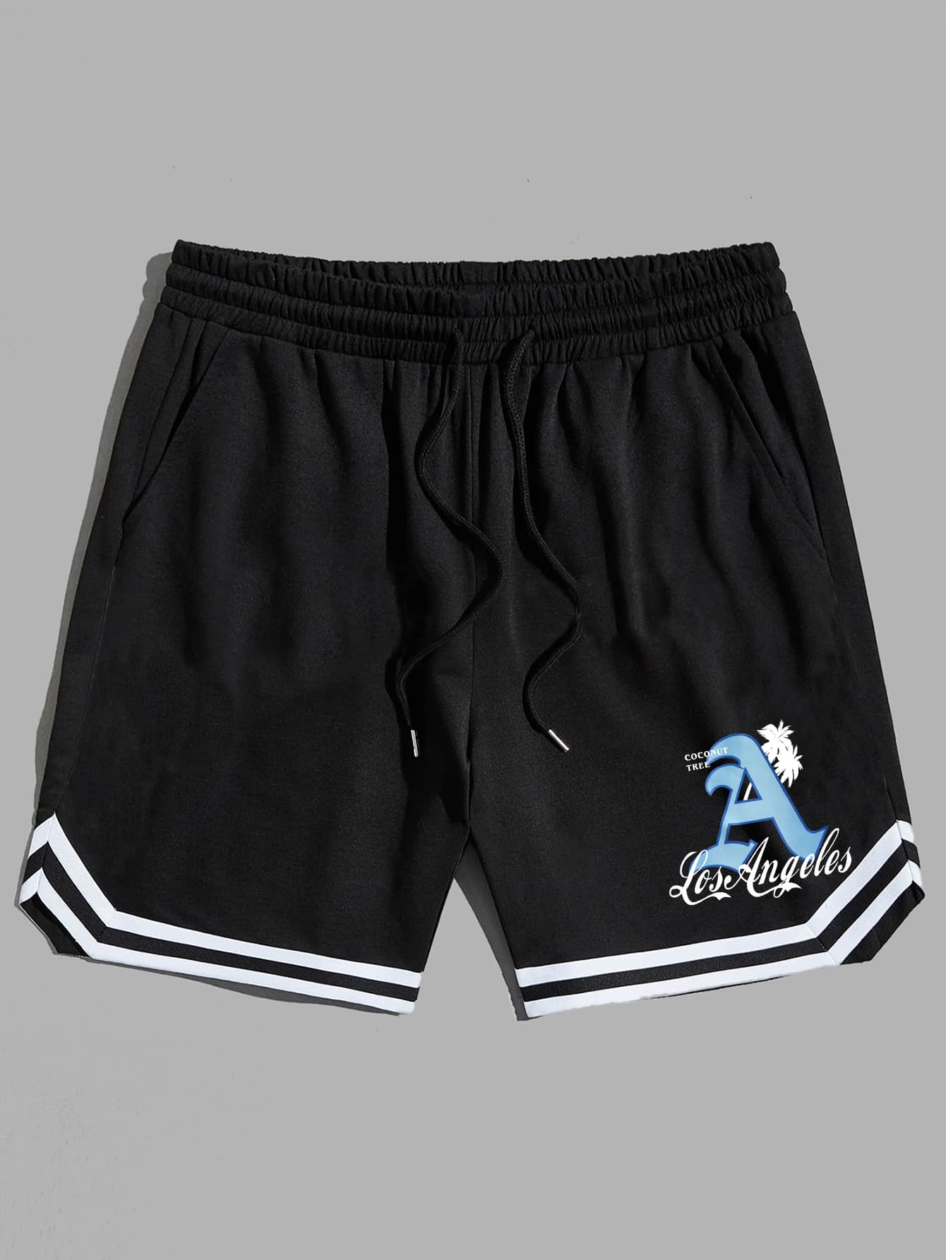 Guys Letter Graphic Striped Trim Drawstring Waist Shorts