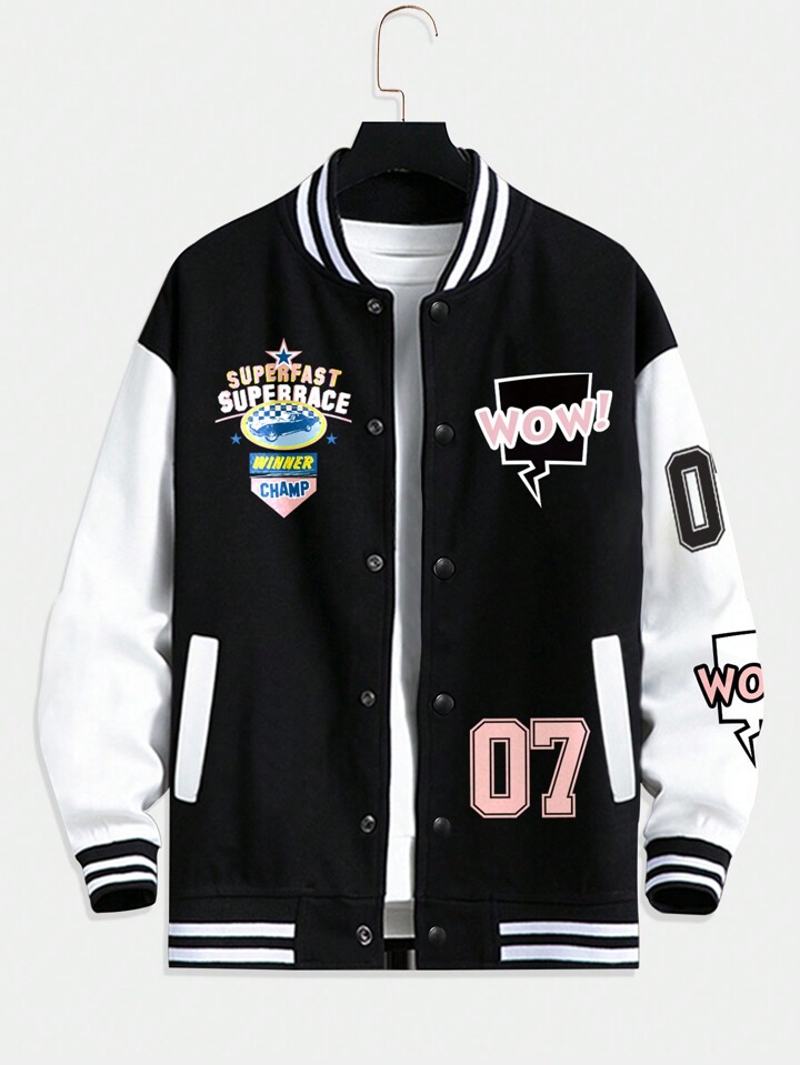 Guys Letter Graphic Striped Trim Drop Shoulder Jacket Without Tee