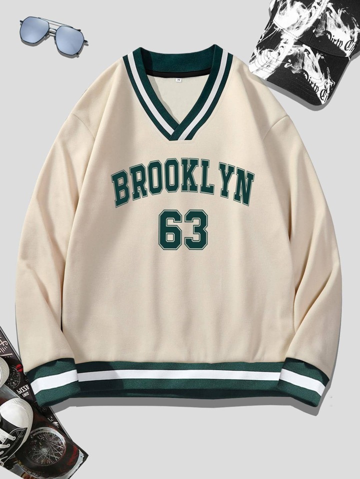 Guys Letter Graphic Striped Trim Thermal Lined Pullover