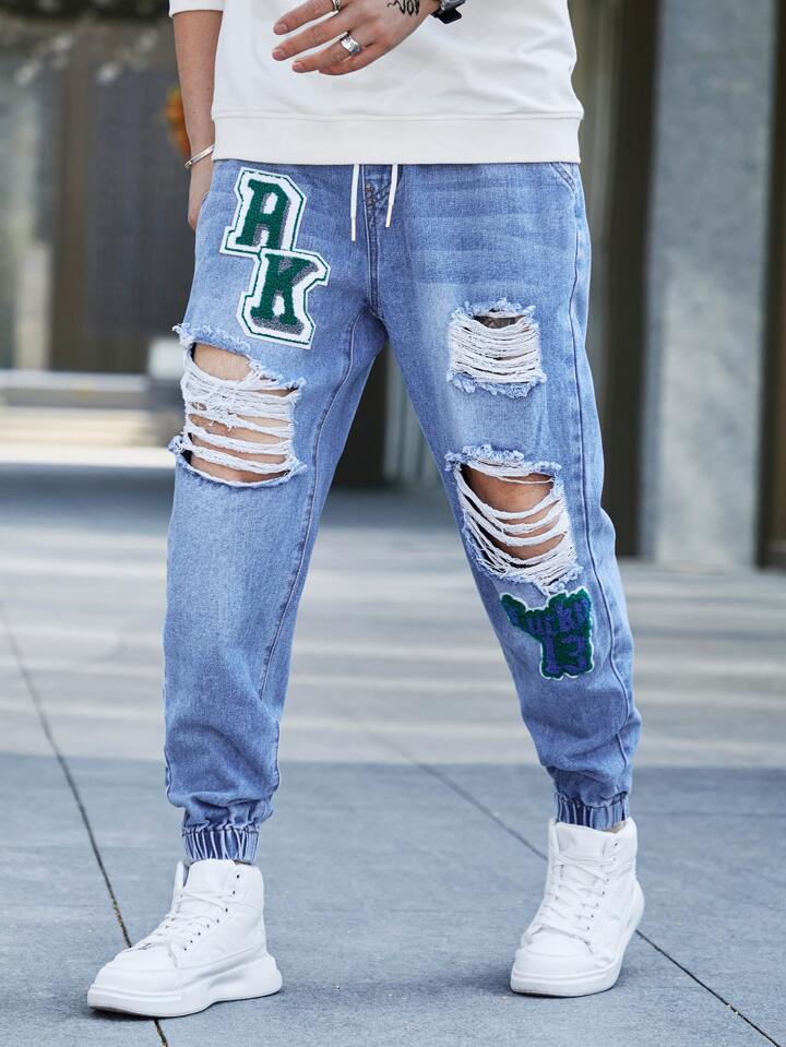 Guys Letter Patched Ripped Jogger Jeans