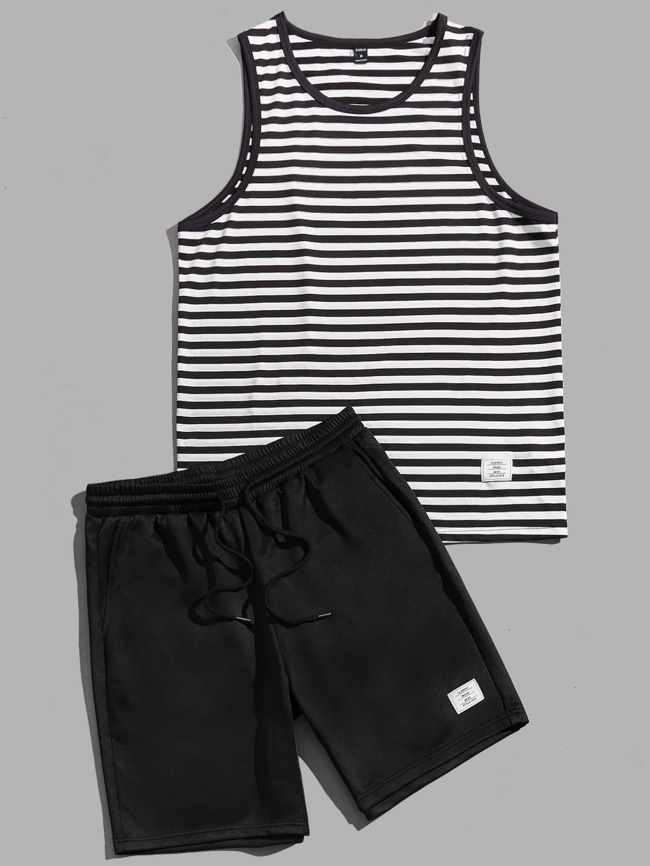 Guys Striped Print Patched Detail Tank Top & Drawstring Waist Shorts