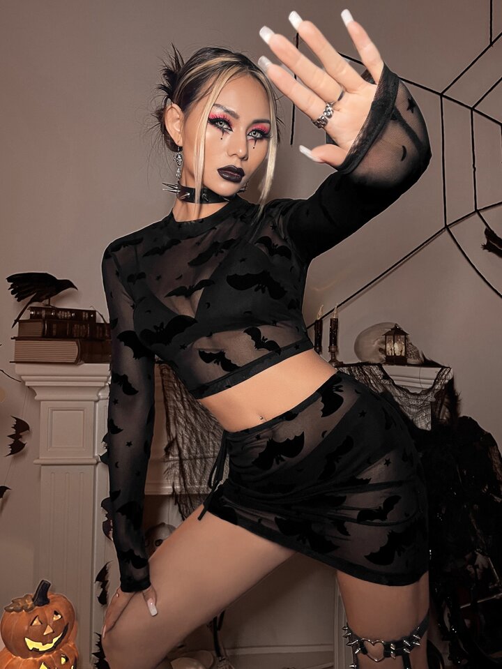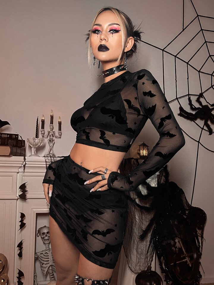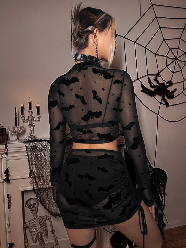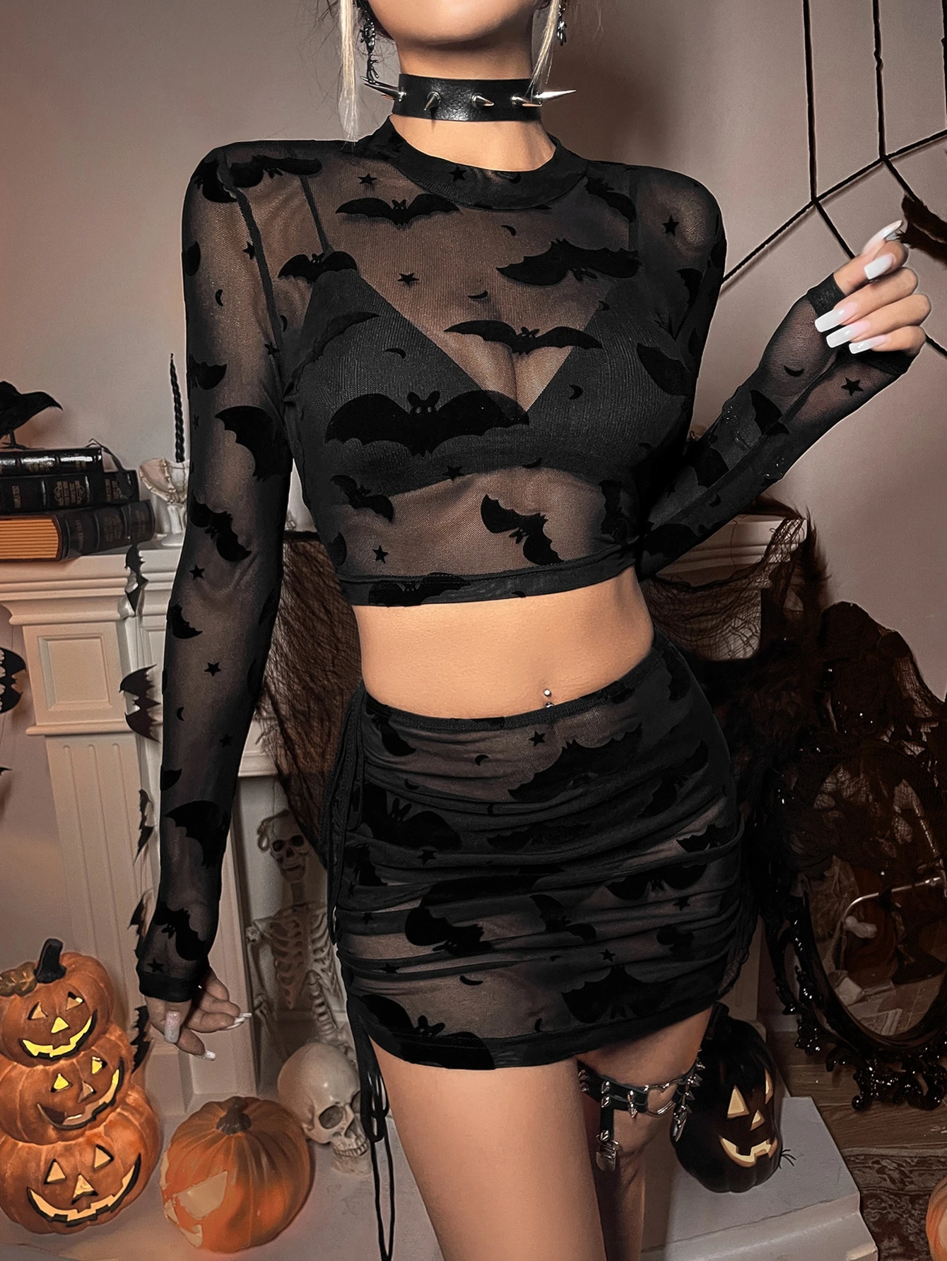 Halloween Print Crop Mesh Top & Drawstring Side Bodycon Skirt Without Lingerie Set