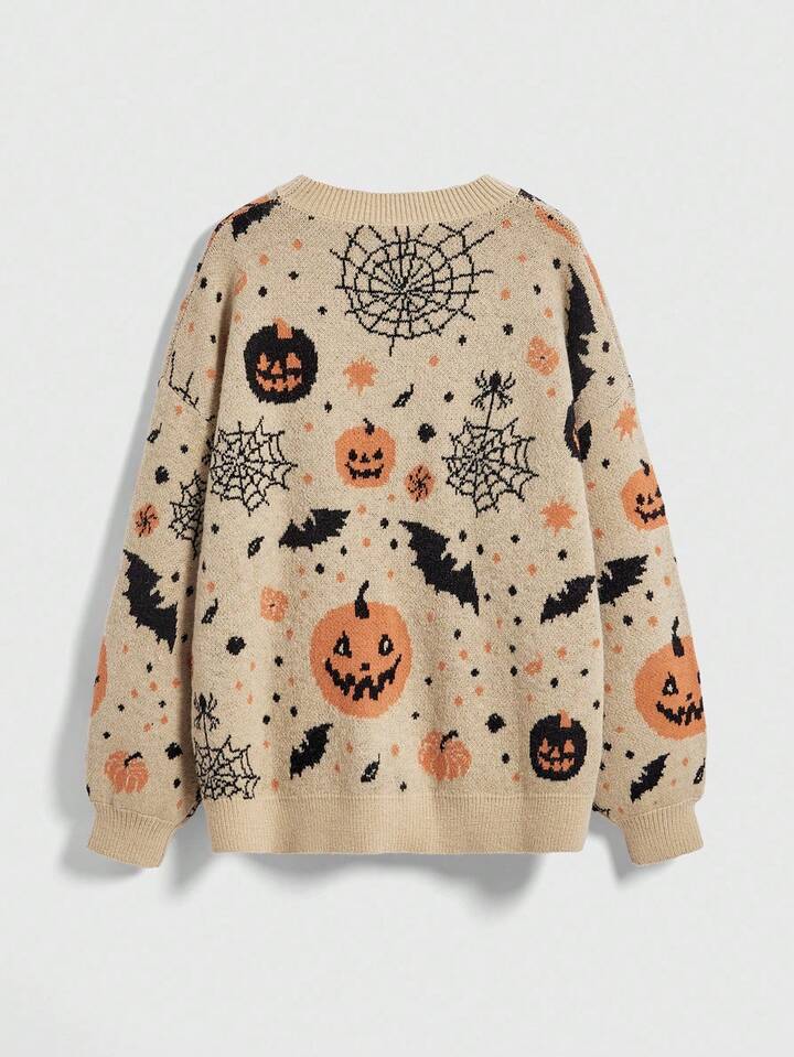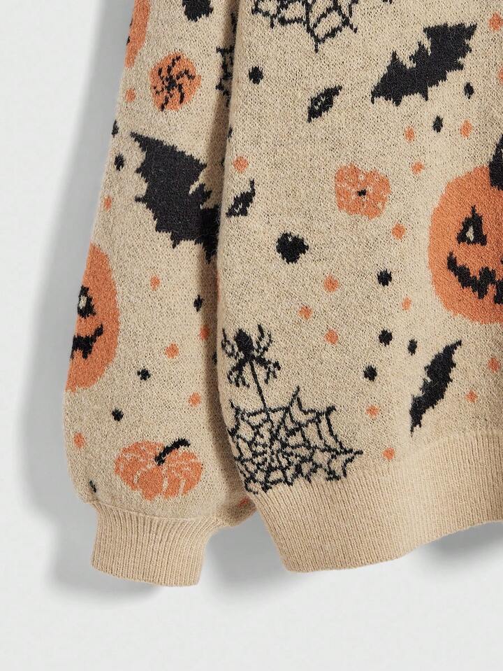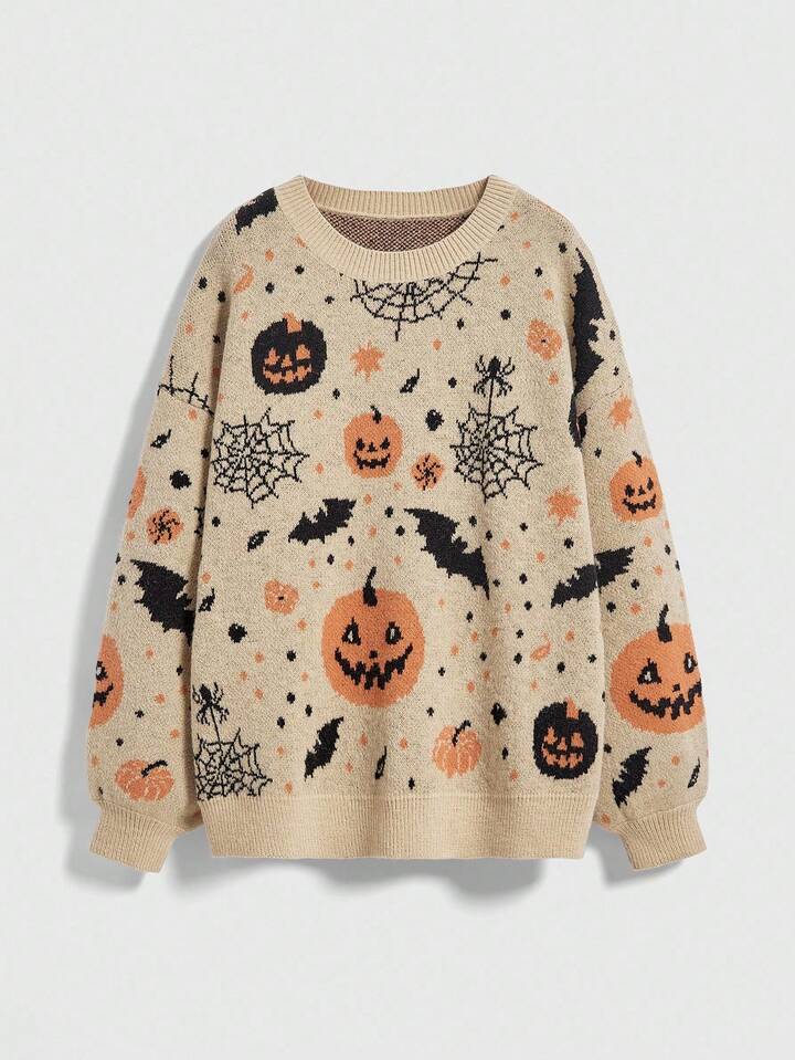 Halloween Pumpkin & Bat Jacquard Knit Sweater For Women, Loose Soft Cozy Festive Vibe Pullover, Autumn/Winter