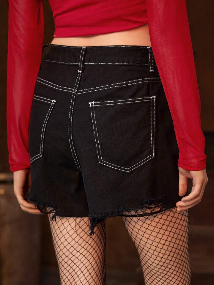 Harley Quinn | ROMWE Letter Print Distressed Frayed Hem Black Denim Shorts Without Belt