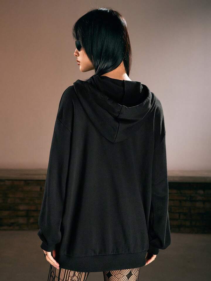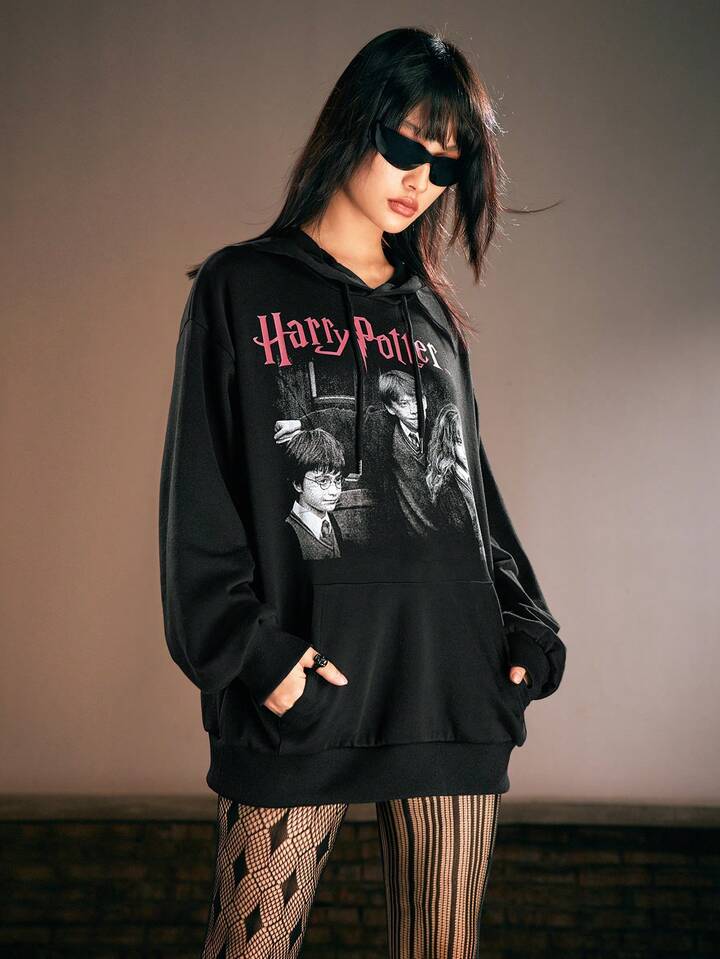 Harry Potter | ROMWE Character Print Drop Shoulder Drawstring Hooded Sweatshirt