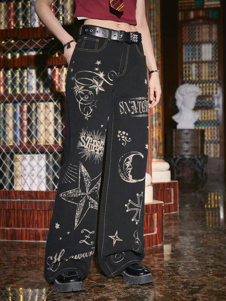 Harry Potter | ROMWE Star & Moon Graphic Wide Leg Jeans