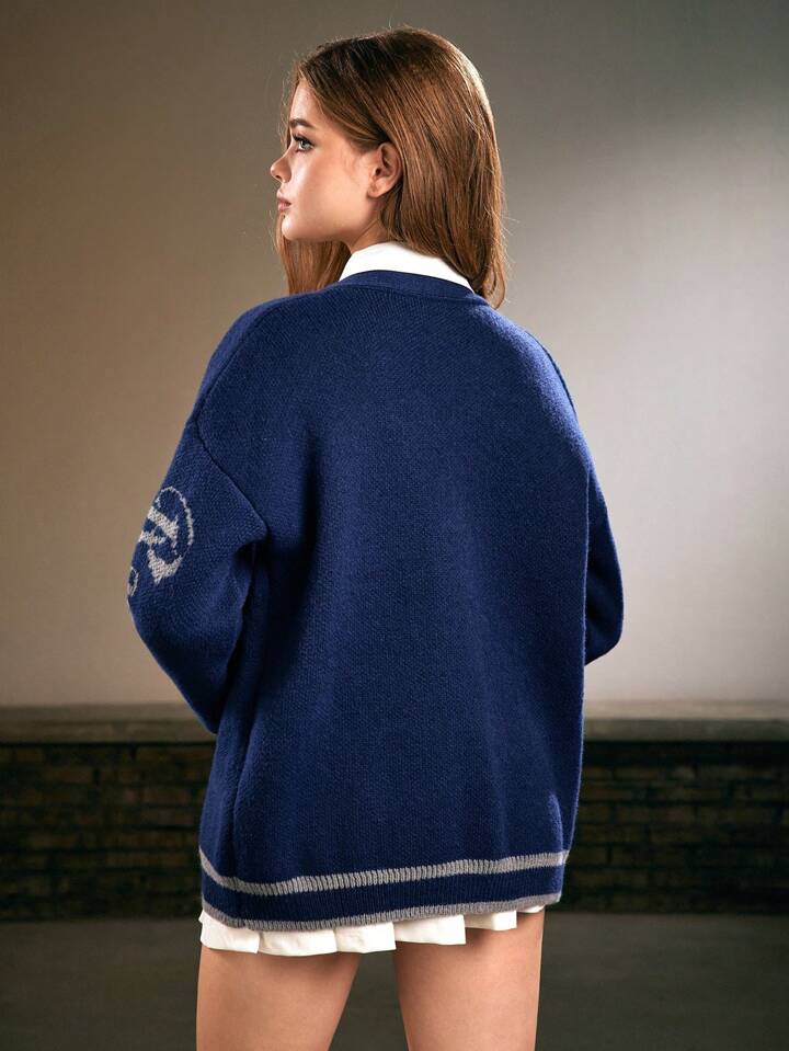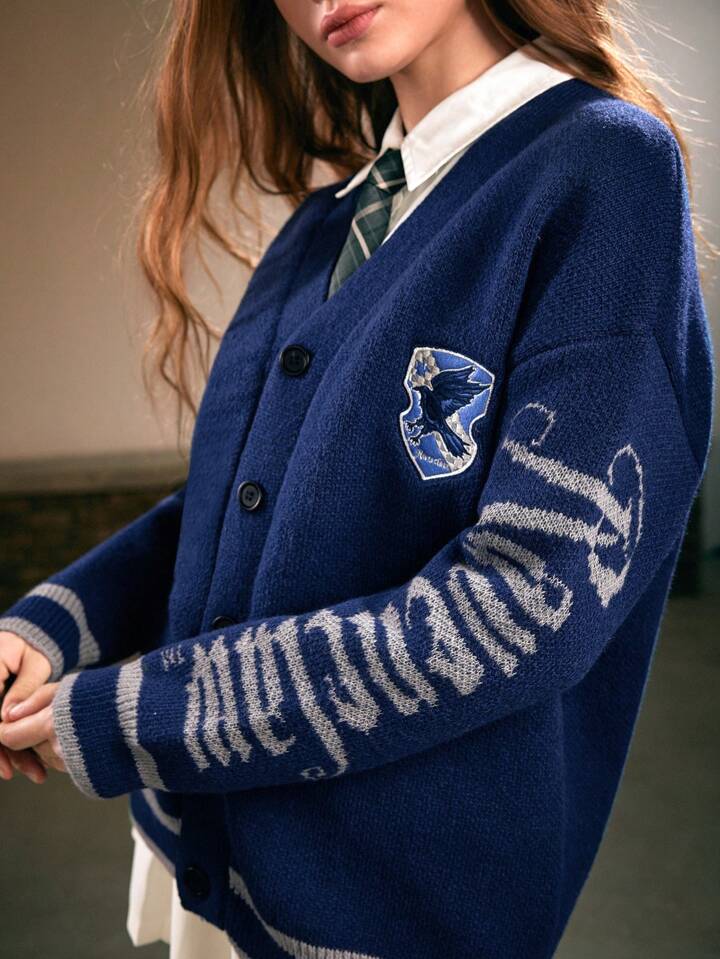 Harry Potter | ROMWE Women's Rauenclaw Letter Embroidered Badge Dropped Shoulder Loose Cardigan Sweater