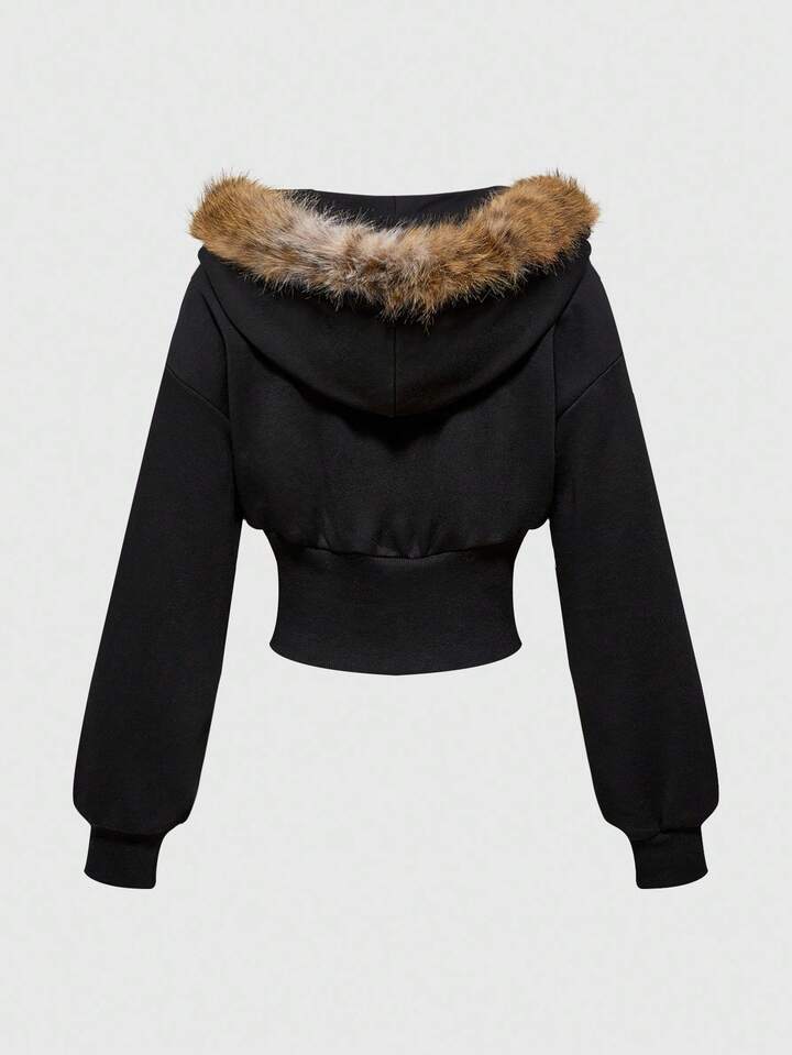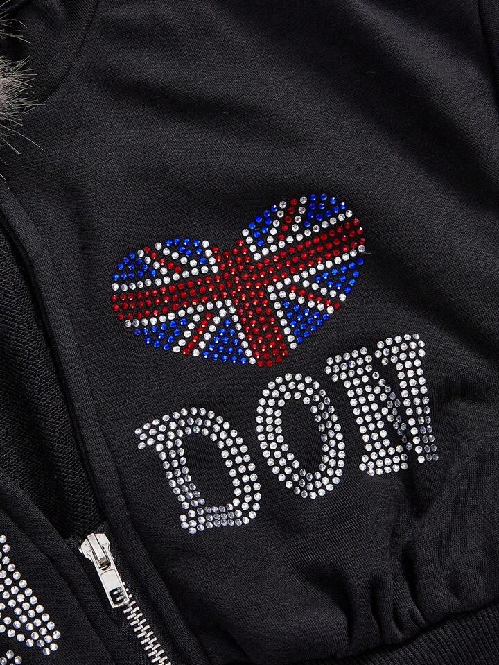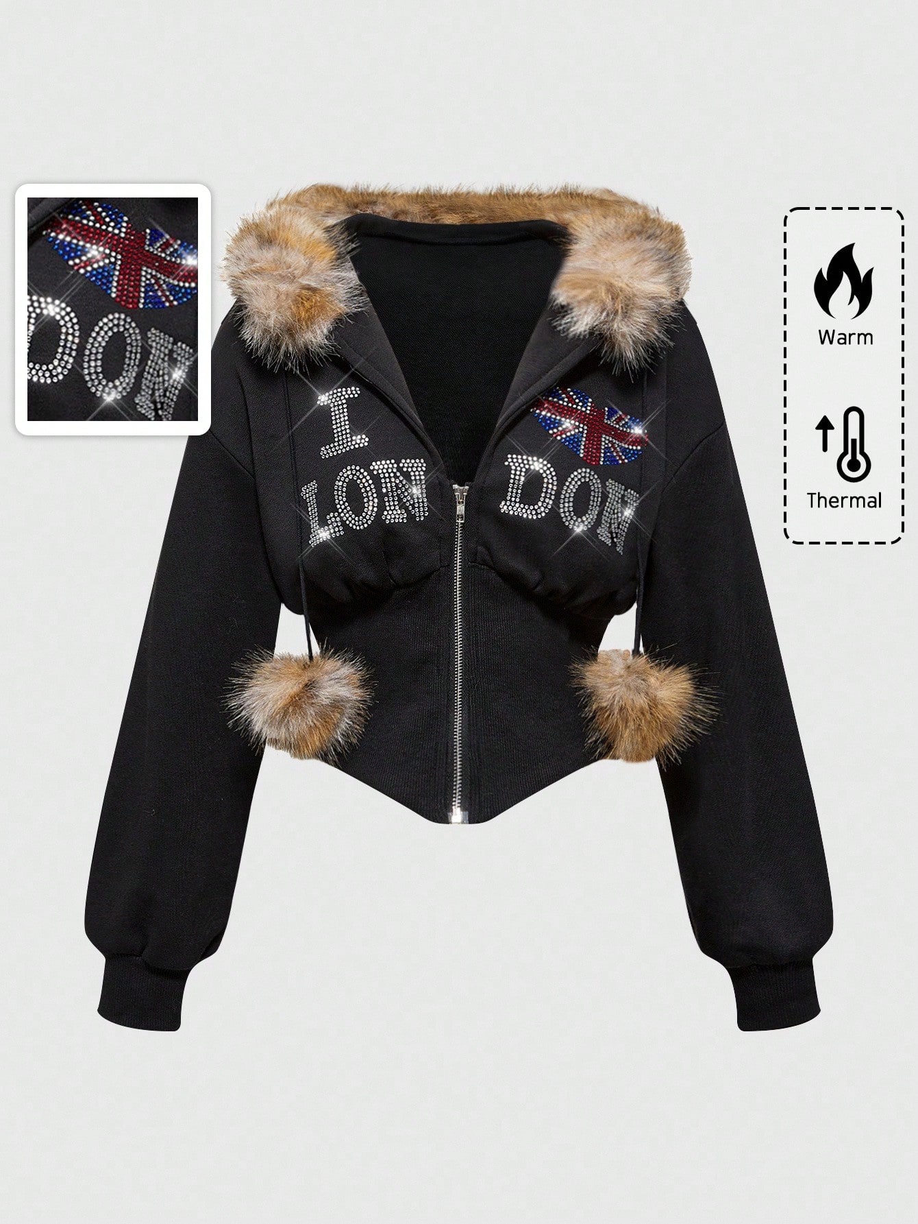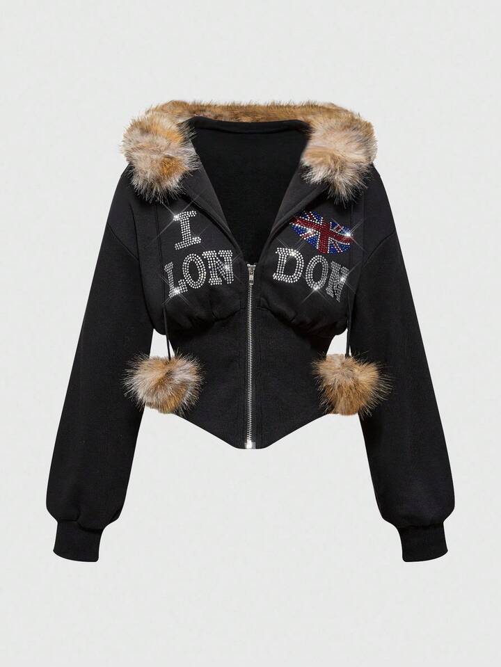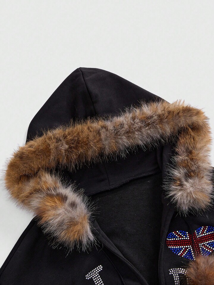 Heart & National Flag Rhinestone Faux Fur Patchwork Fitted Hoodie