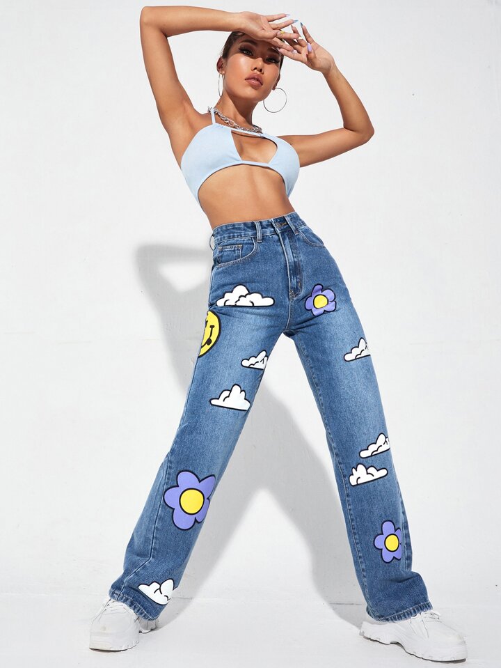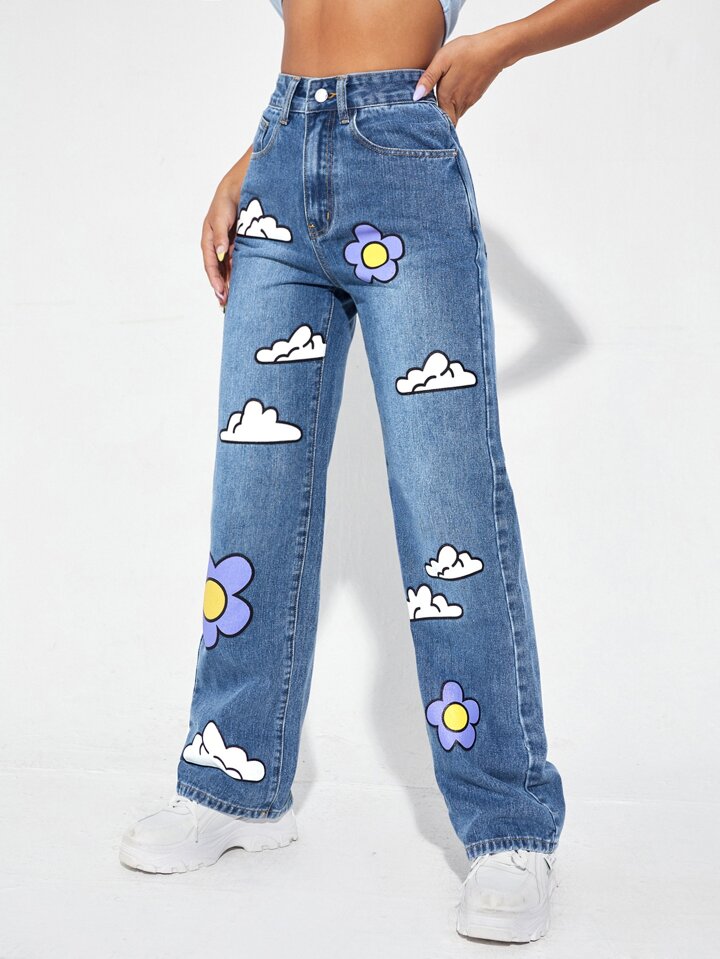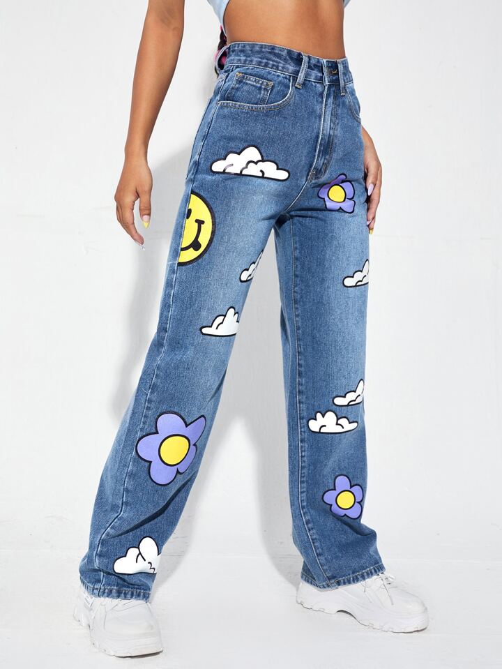 High Waist Cartoon Graphic Wide Leg Jeans