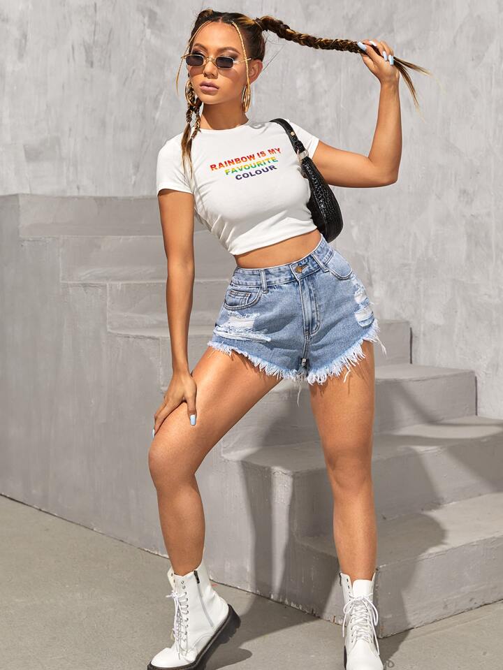 High Waist Ripped Raw Hem Denim Shorts