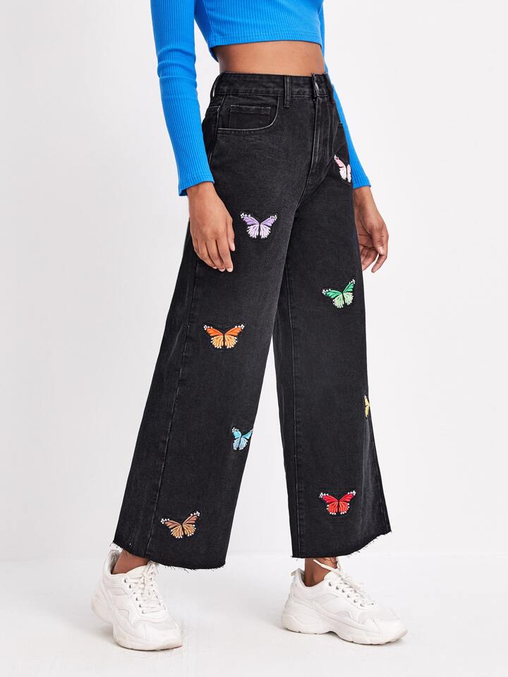 High Waisted Butterfly Embroidery Wide Leg Jeans