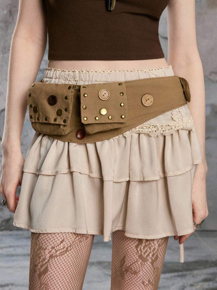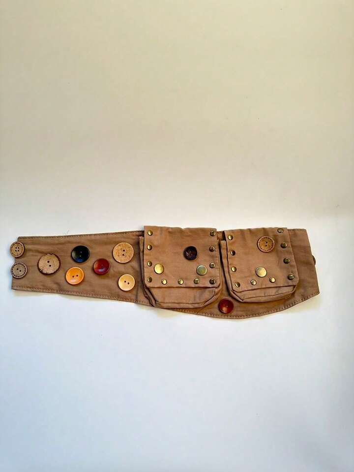 Hippie 1 X Vintage Bohemian Brown Belt Bag With Mixed Buttons And Rivets - Unique Handmade Belt Bag (Button Pattern And Size Random)