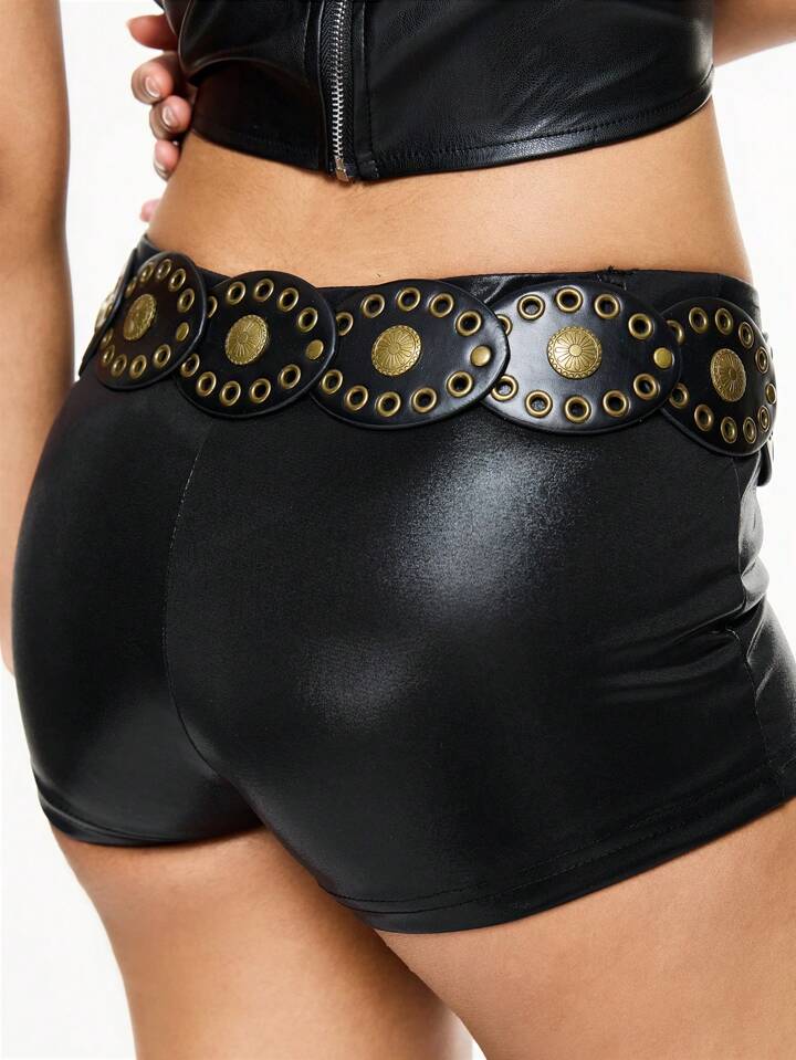 Hippie 1pc Women Hollow Flower Buckle Decor Black Oval Leather Round Metal Grommet Decor Bohemian Western Style Belt, Versatile For Dresses, Jeans, Casual Wear