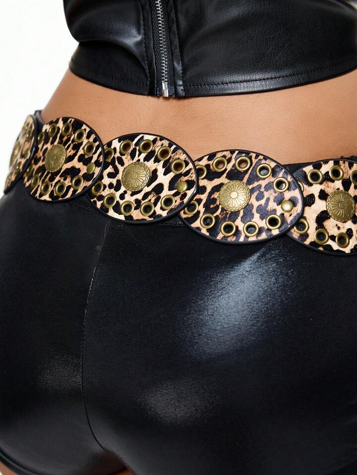 Hippie 1pc Women Hollow Flower Button Decor, Leopard Print Oval Leather Large Round Metal Grommet Boho Western Style Belt, Fashion Accessory For Dress, Jeans