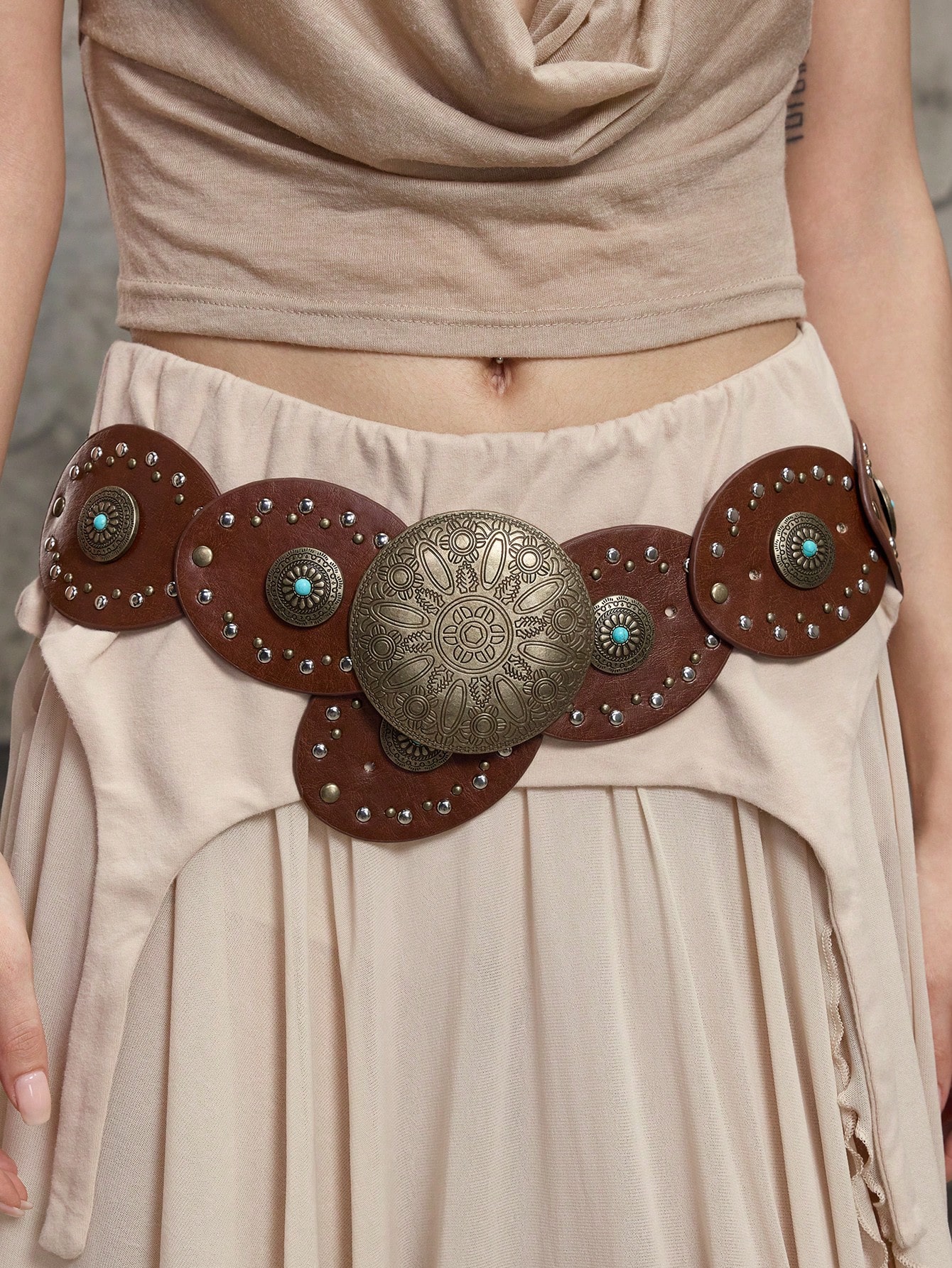 Hippie 1pc Women's Brown Two-Tone Mushroom Stud Turquoise Accessories Leather Decorative Wide Belt, Versatile Daily Wear Denim Jeans Accessory