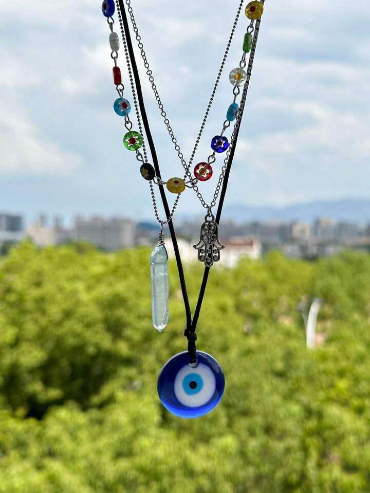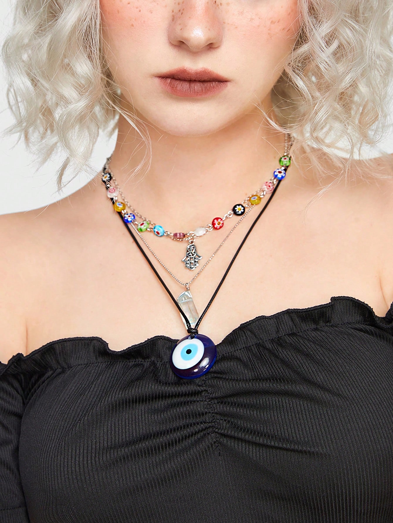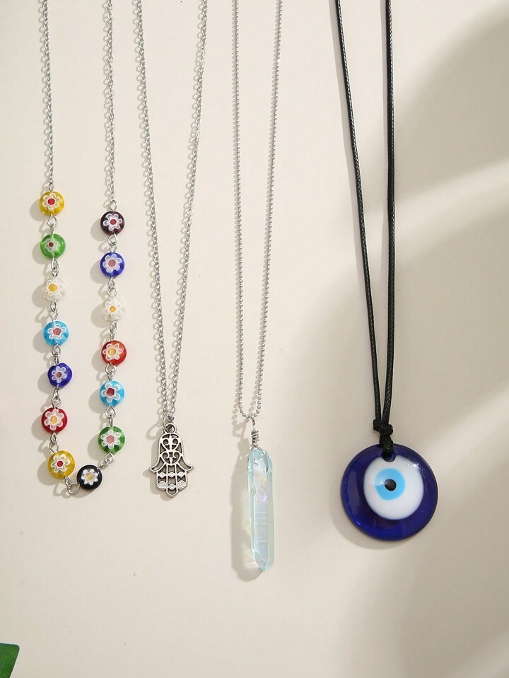 Hippie 4pcs Crystal Stone Pendant Flower Beaded Necklace Set(random Flower Color)