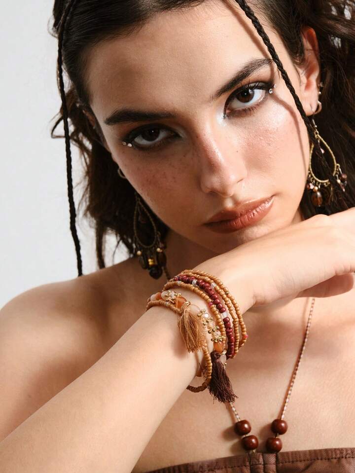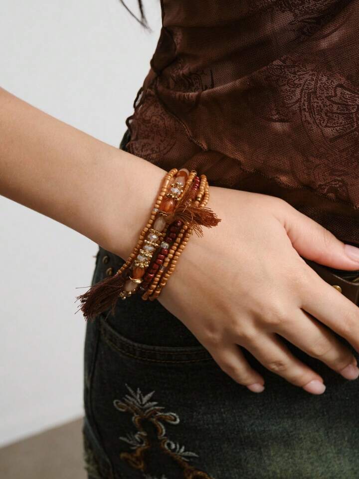 Hippie 6pcs Boho Multi-Layer Beaded Tassel Bracelet For Women