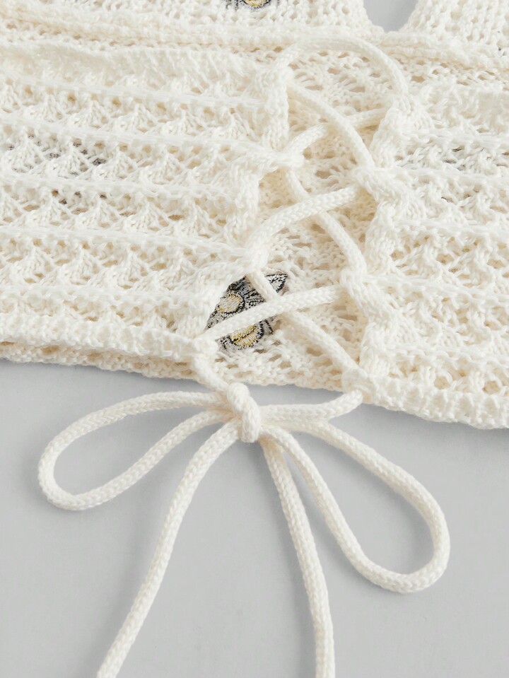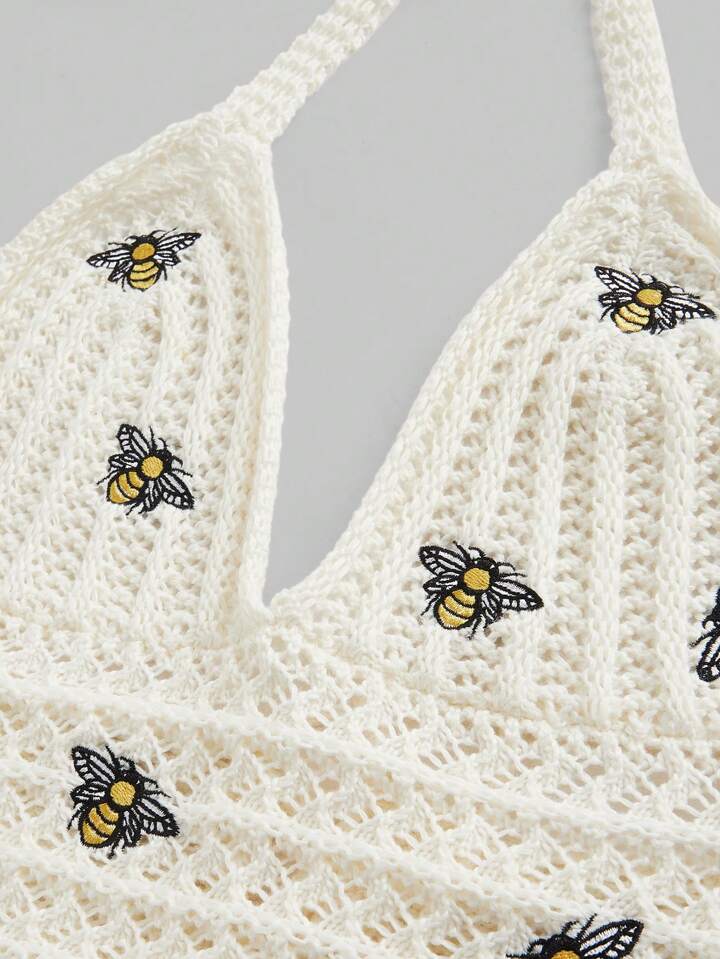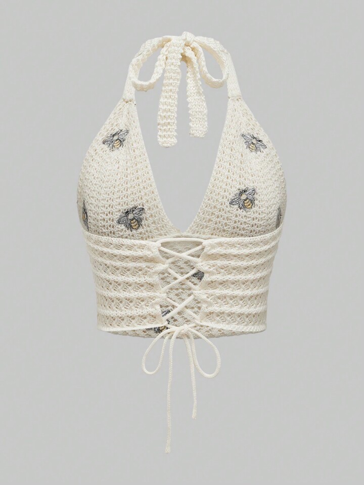 Hippie Bee Embroidered Vacation Style Lace Up Crochet Knit Halter Top