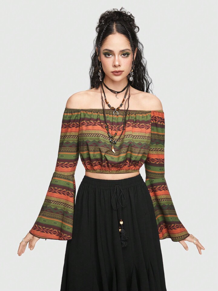 Hippie Color Block Geometric Print Off Shoulder Flare Sleeve Shirt