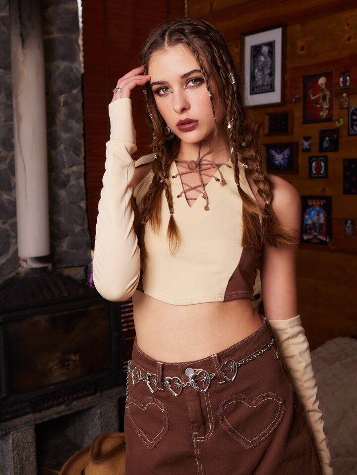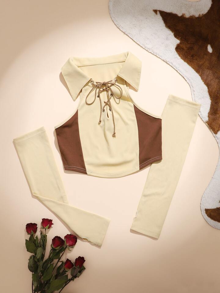 Hippie Colorblock Lace Up Top & 1pair Oversleeve