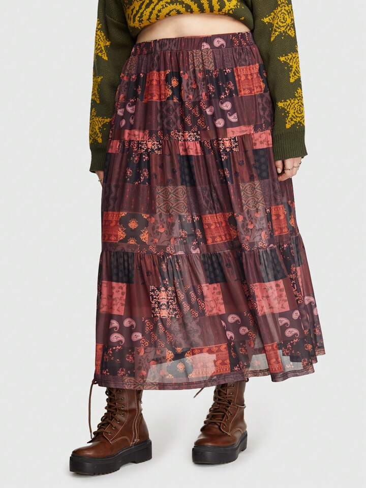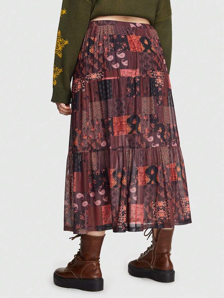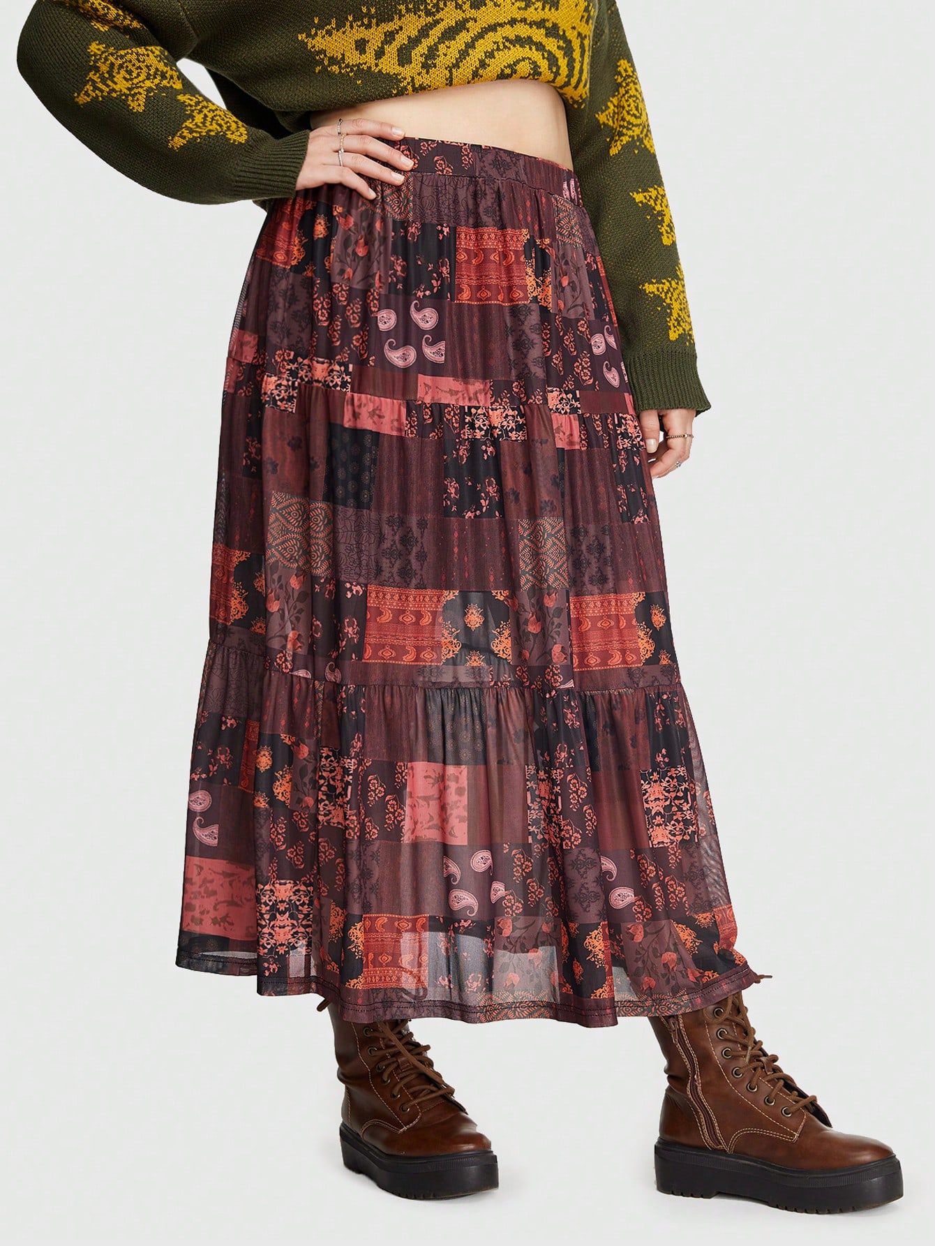 Hippie Plus Patchwork Print Layered Ruffle Hem Skirt