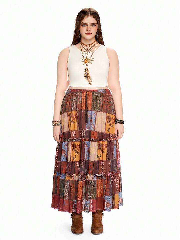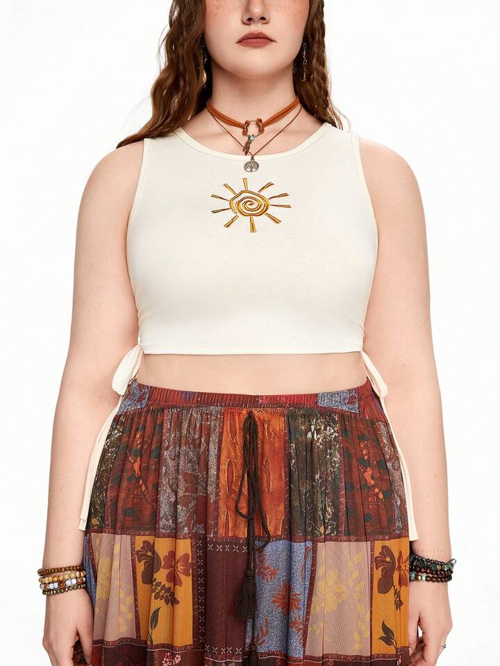 Hippie Plus Size Spiral Sun Embroidered Pleated Tie Round Neck Tank Top