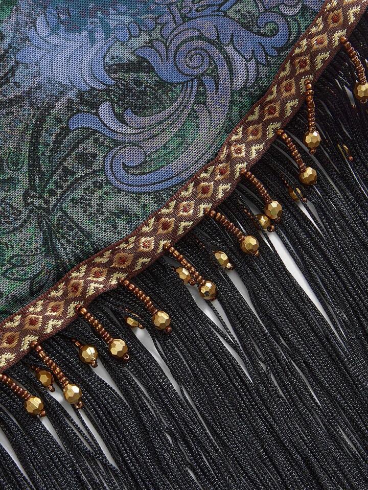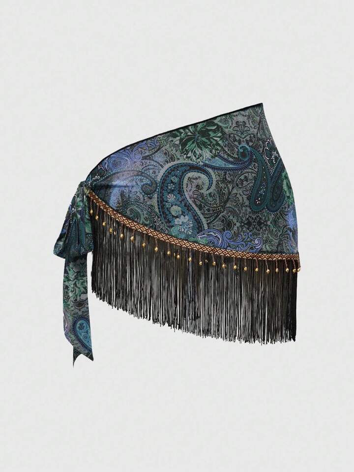 Hippie Plus Size Women Retro Bohemian Western Music Festival Paisley Print Drawstring Waist Fringed Hem Beaded Mesh Skirt