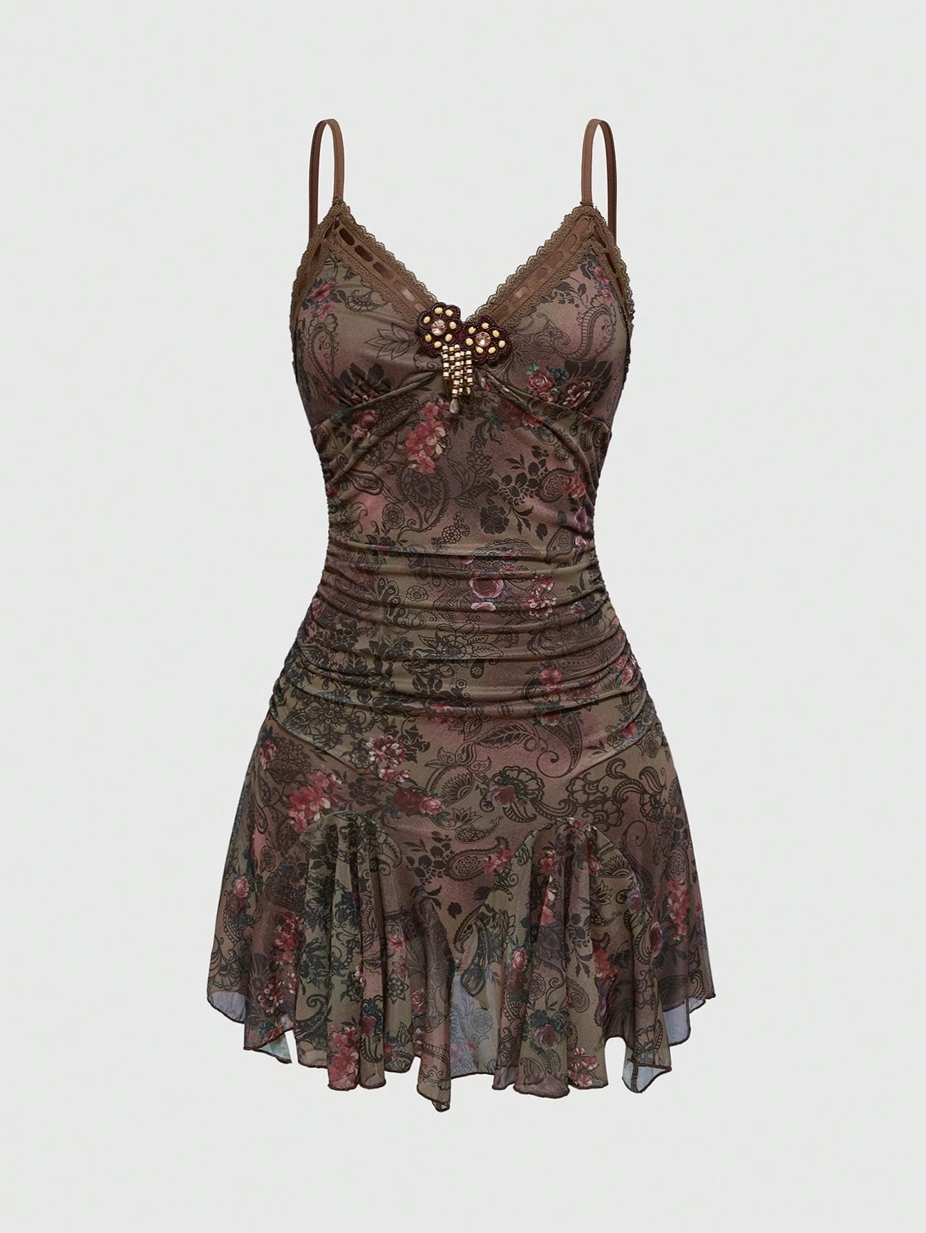 Hippie Plus Size Women Vintage Boho Floral Lace Ribbon Midi Dress With Ruffle Trim