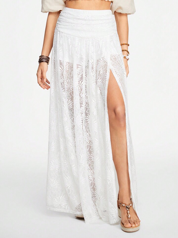 Hippie Solid Color Pleated Vacation Skirt With Slit Designs Inspired By Leaves