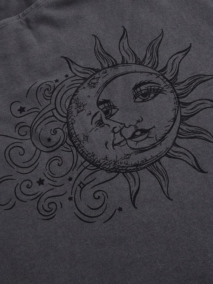 Hippie Sun & Moon Graphic Asymmetrical Neck Crop Tee