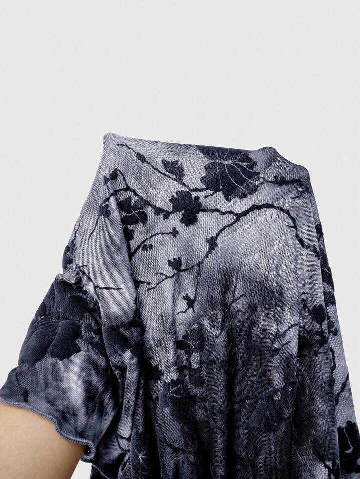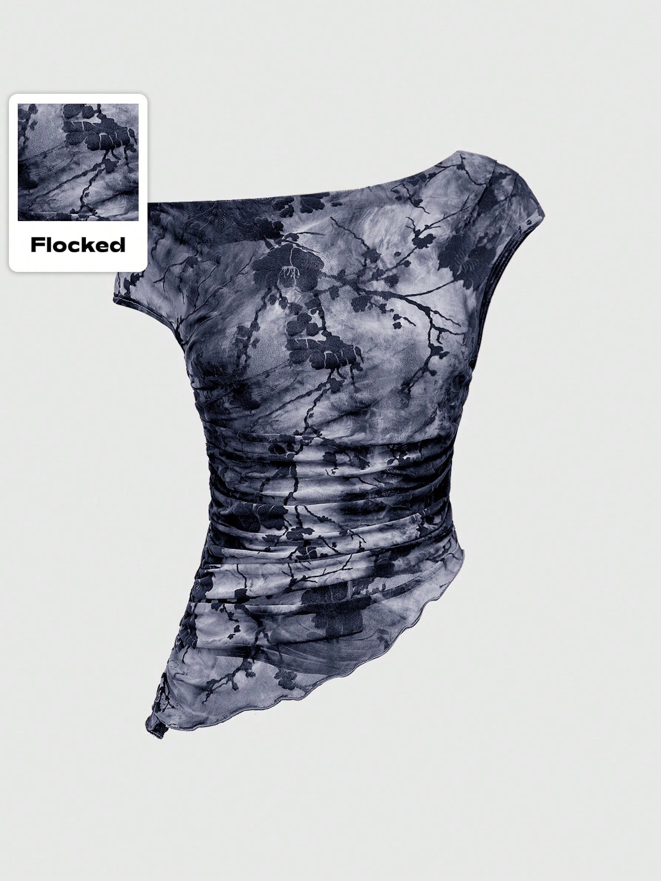 Hippie Vintage Floral Flocked Tie-Dye Women Sheer Shoulder Cinched Waist Blouse