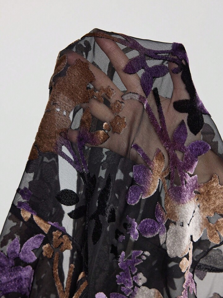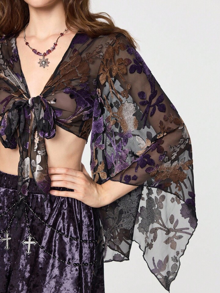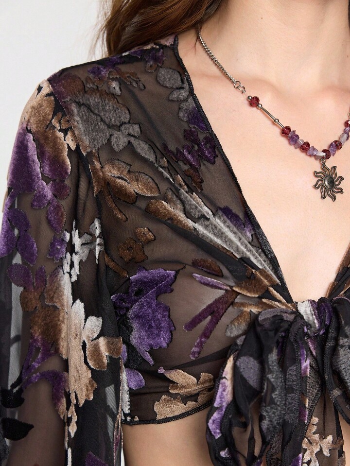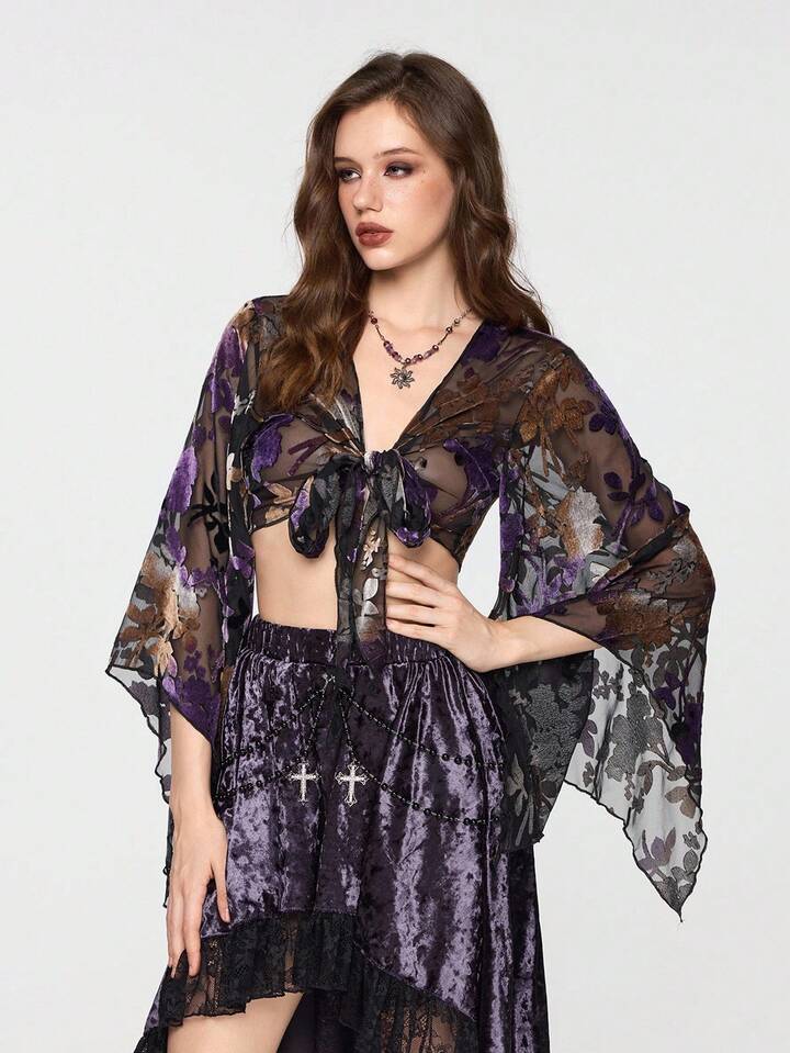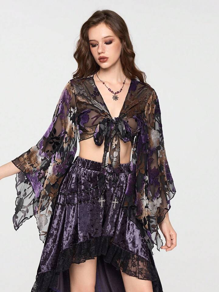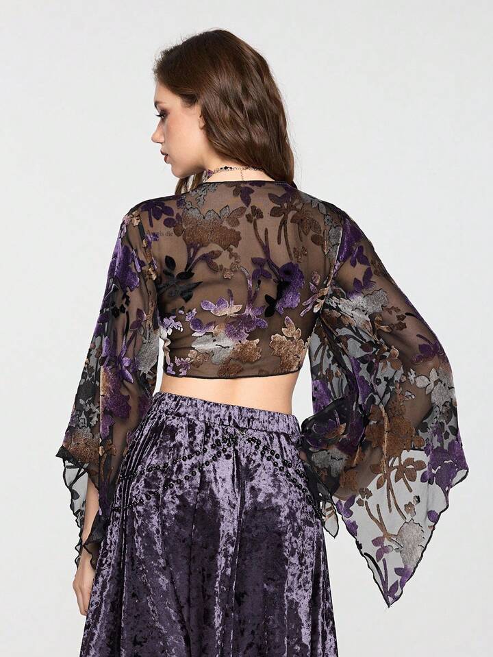 Hippie Women's Floral Flocked Sheer Sexy Dark Luxurious Palace Ruffle Sleeve Blouse