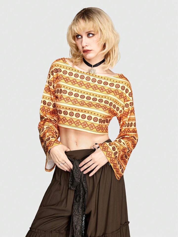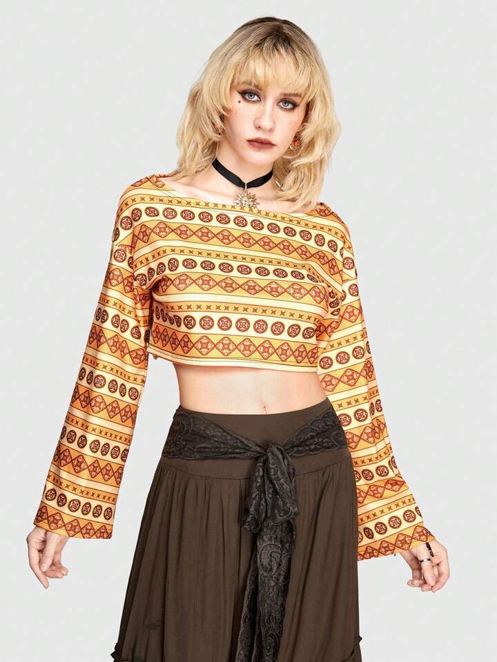 Hippie Women's Geometric Pattern Bell Sleeve T-shirt