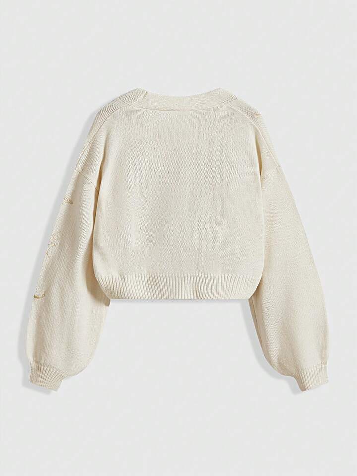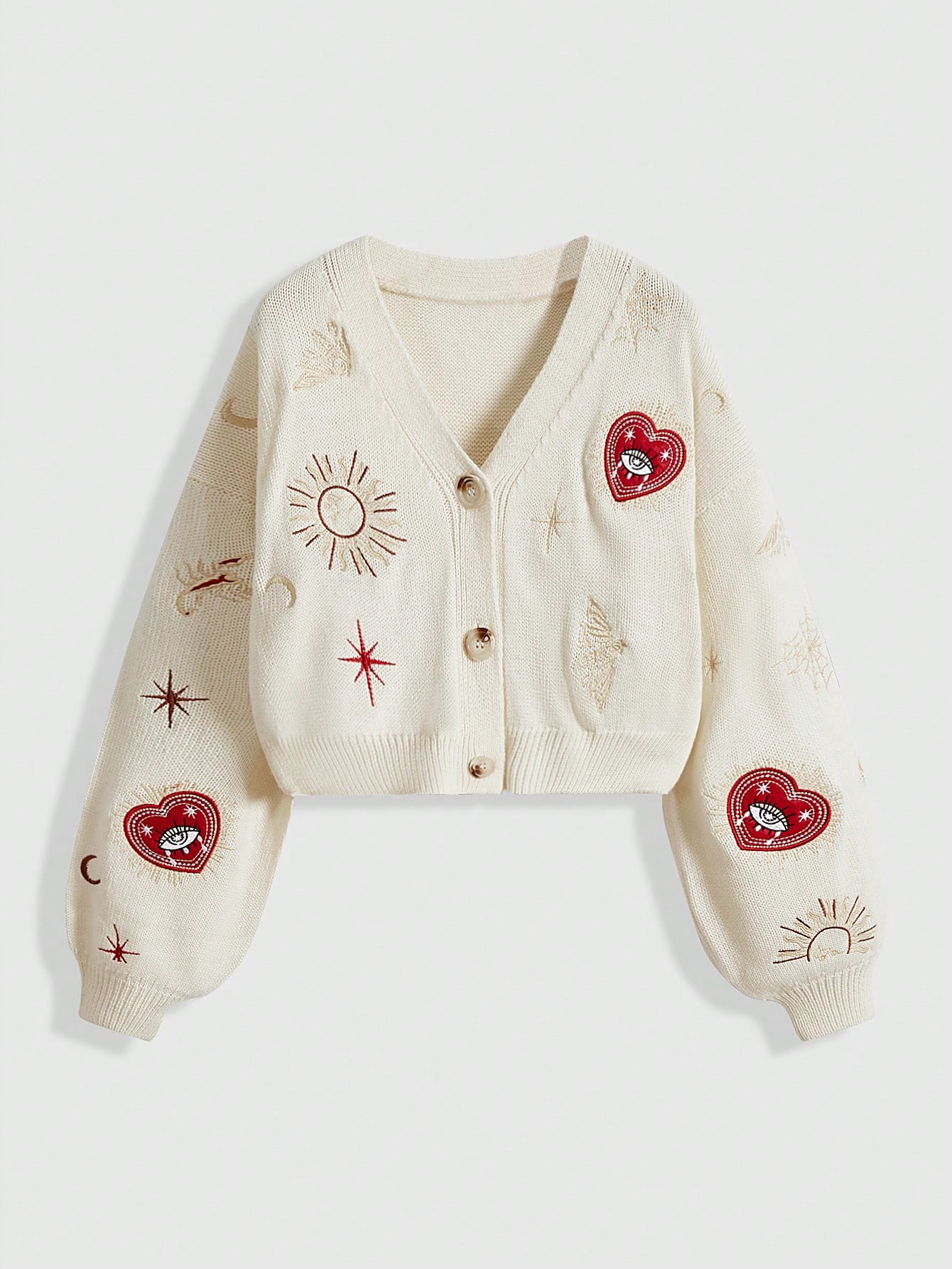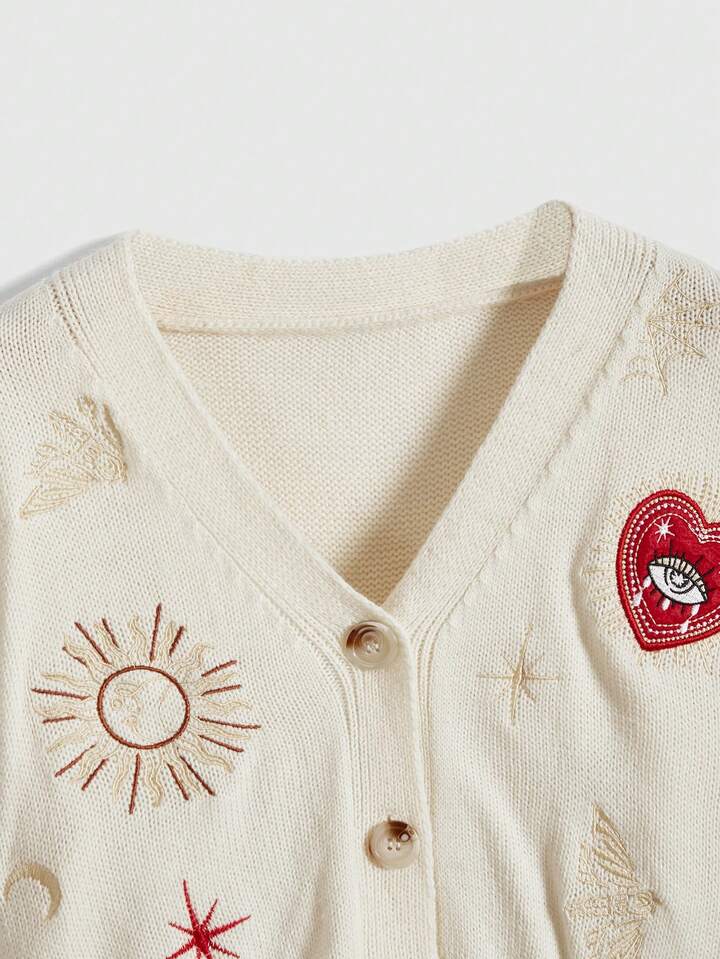 Hippie Women's Retro Palace Heart, Eye, Sun, Moon, Star, Moth Embroidered V-Neck Knitted Cardigan