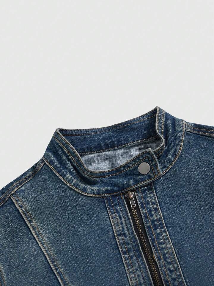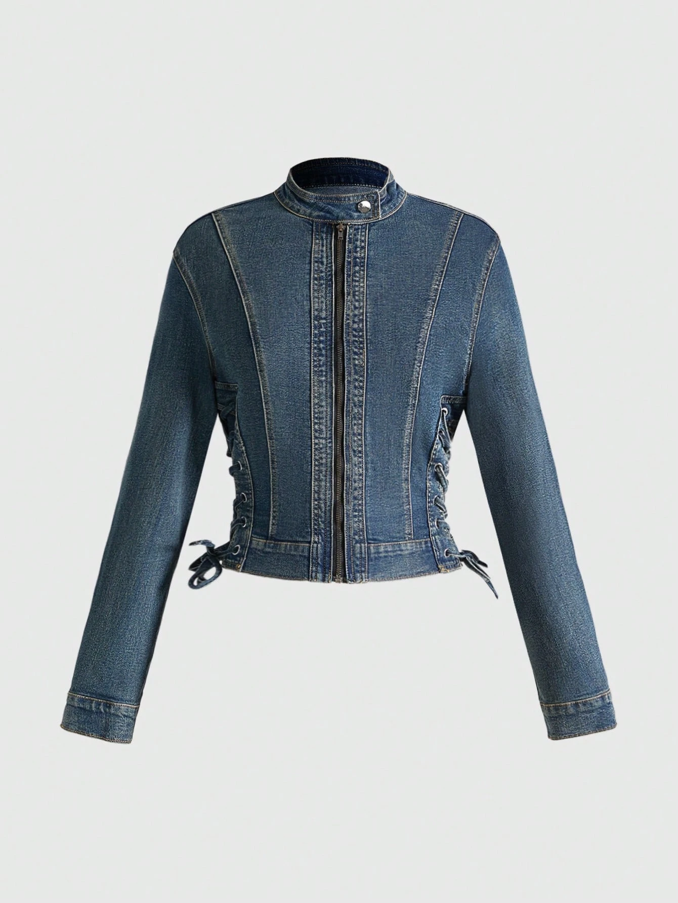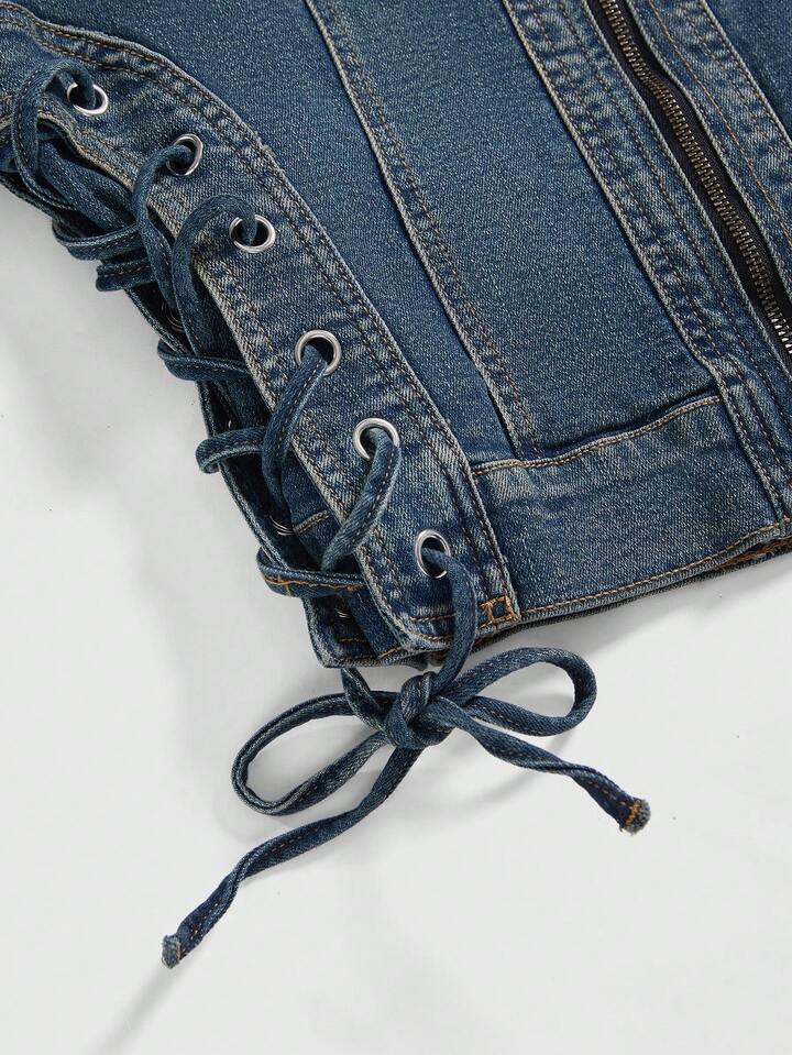 Hippie Women's Y2K Western Vintage Washed Denim Biker Jacket With Side Waist Grommets And Lace-Up
