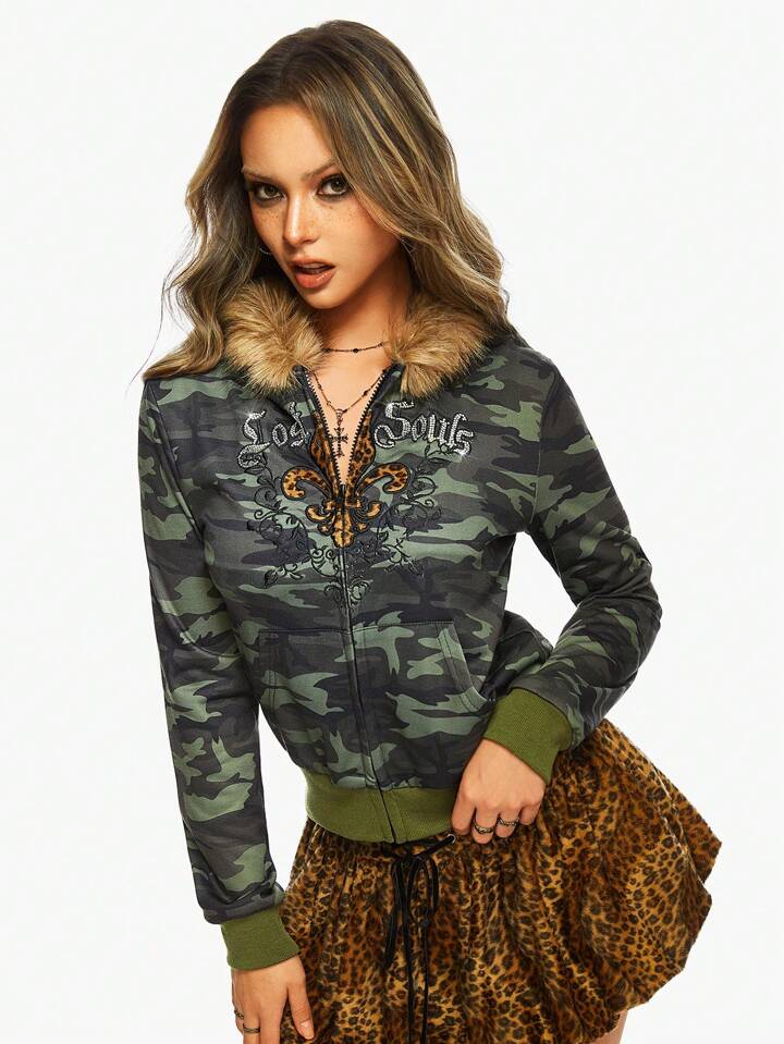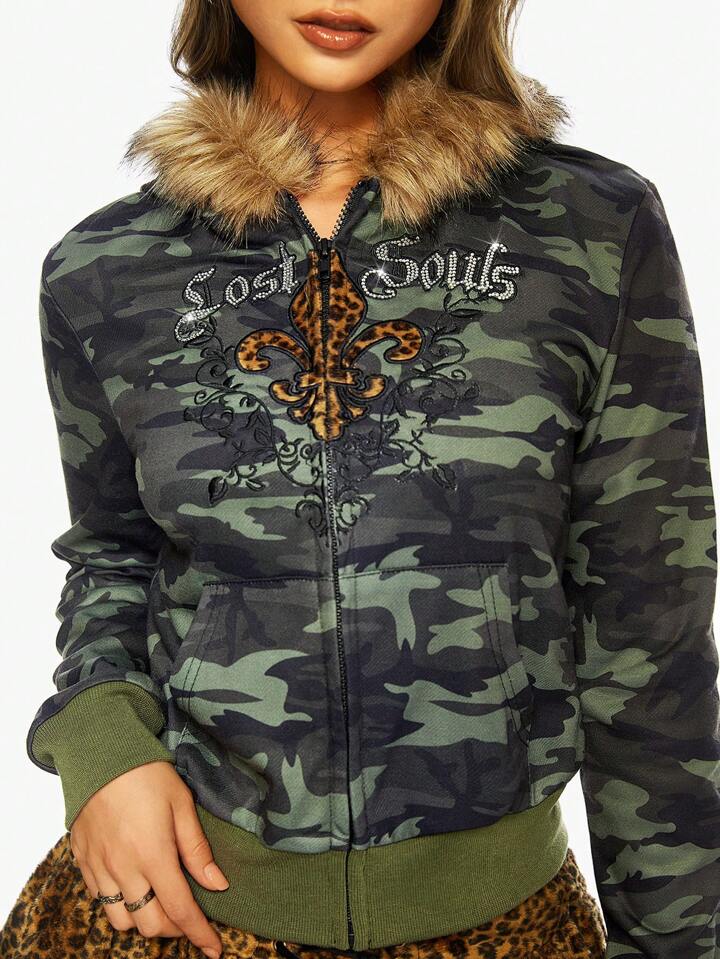 Hippie Y2K Gyaru Baddie Harajuku Camouflage, Leopard Print & Rhinestone Furry Zip Up Sweatshirt For Women